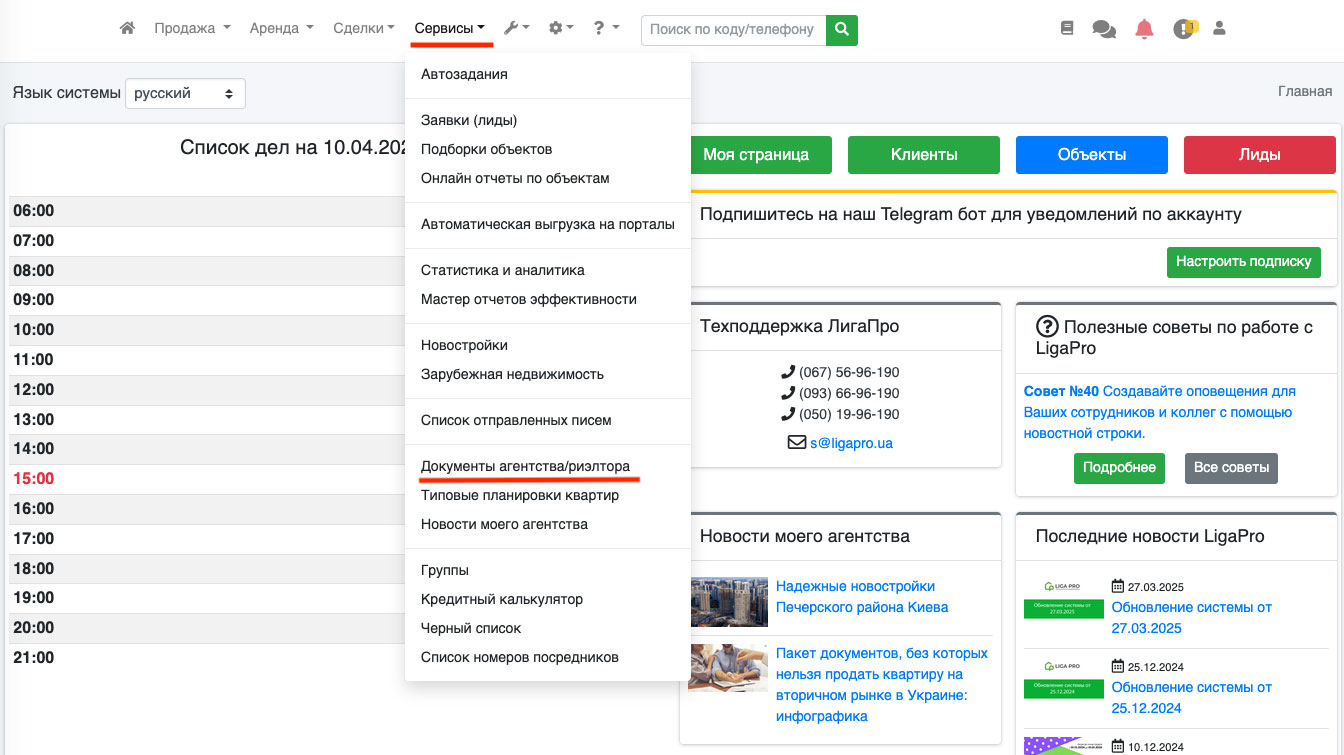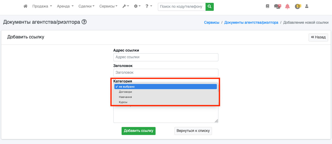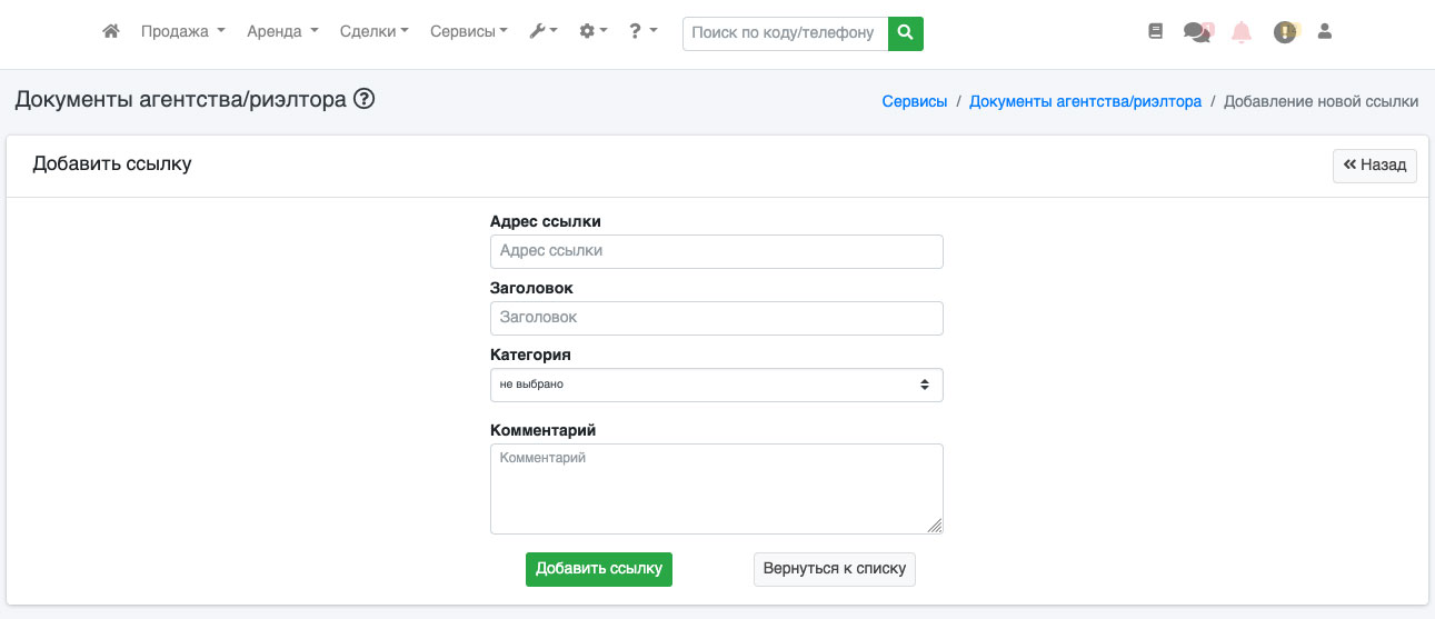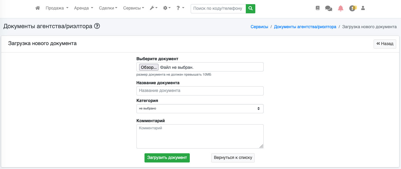 Даний розділ призначений для зберігання документів агентства або ріелтора (Рис. 280). Максимальний обсяг файлу для завантаження складає 5Мб. Також передбачена можливість завантажувати посилання на інші інтернет-ресурси, наприклад на Google Диск. Таким чином у цьому сервісі Ви можете зібрати всю необхідну інформацію, яка може знадобитися користувачам системи.