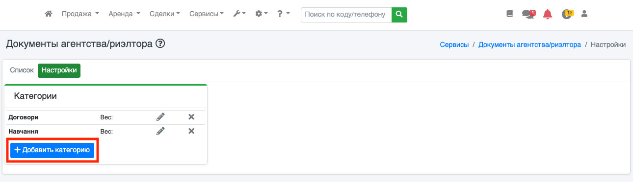 У випадку, якщо у Вас багато посилань або документів, існує можливість створювати додаткові категорії, щоб можна було швидко фільтрувати список документів/посилань. Для цього перейдіть у розділі «Документи» на вкладку «Налаштування» (Рис. 286).