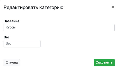 У Вас відкриється діалогове вікно, де Ви можете внести зміни в назву категорії та задати вагу, після чого натисніть кнопку «Зберегти» (Рис. 291). Зміни будуть застосовані.