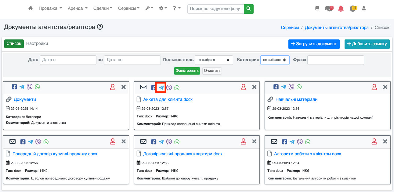 Для зручності будь-який документ можна надіслати у месенджер. Для цього знайдіть потрібний Вам документ і натисніть на потрібний месенджер (Рис. 296). Також документи можна надсилати на пошту — просто натисніть на іконку конверта.
