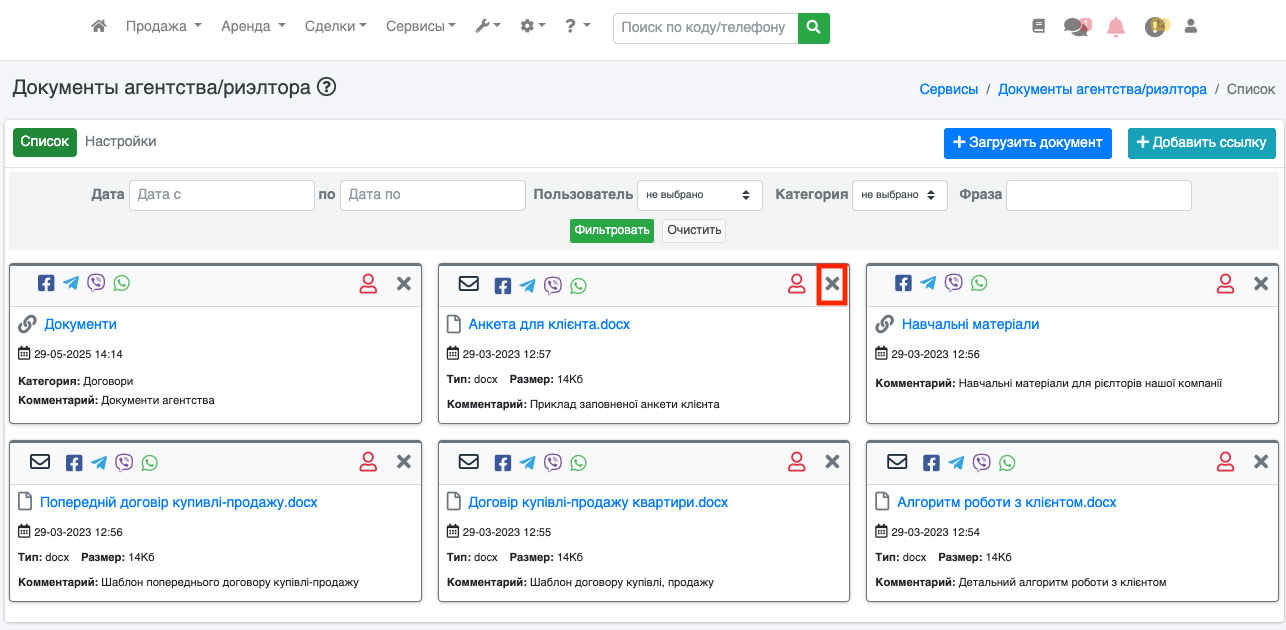 Щоб видалити документ, натисніть на іконку «Хрестик» поруч із потрібним документом (Рис. 298).