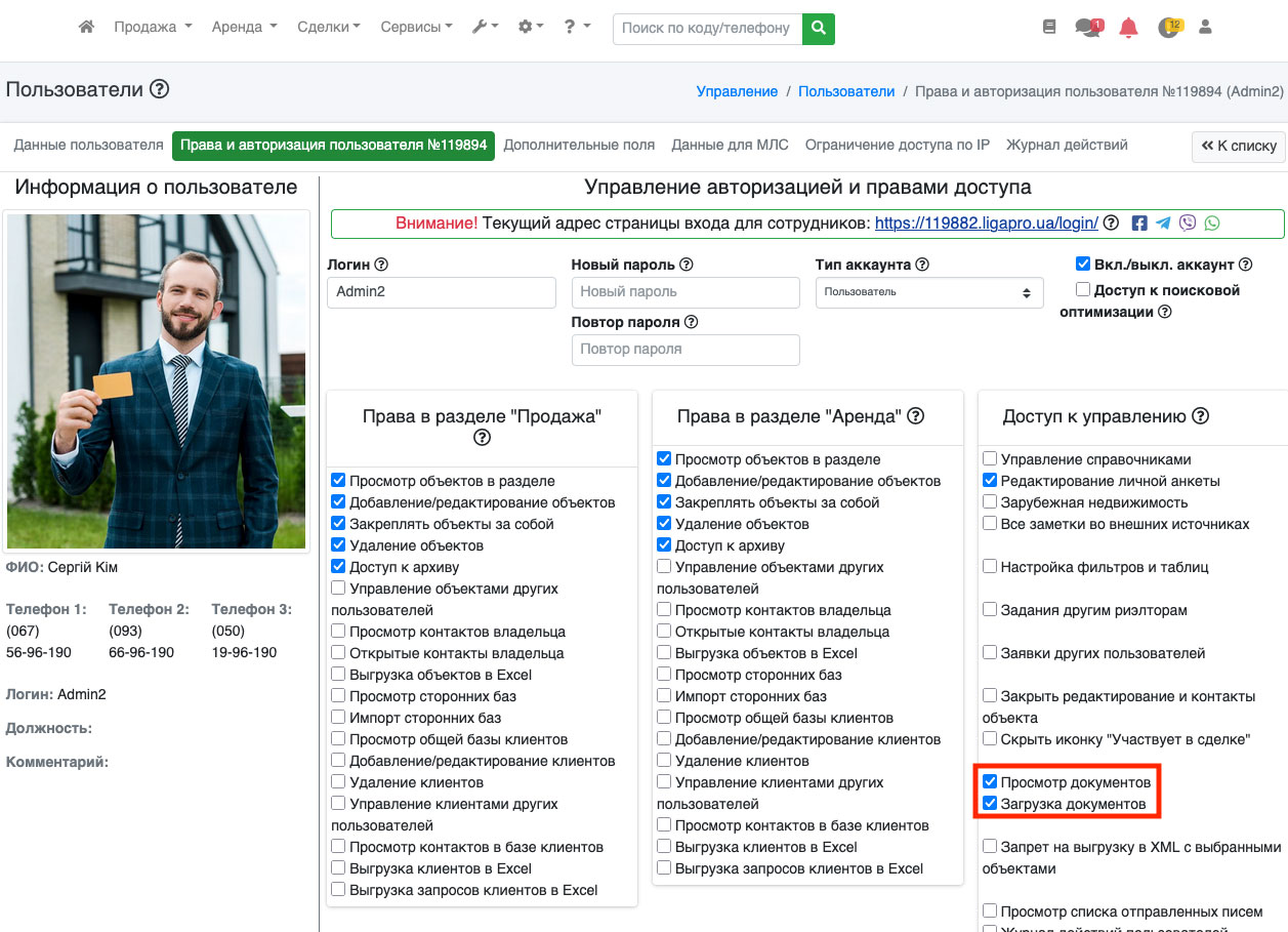 Для кожного користувача Ви можете призначити права доступу до документів (перегляд документів і завантаження документів) в розділі «Управління-Користувачі» для того, щоб користувач міг переглядати або завантажувати файли (див. Пункт Користувачі) (Рис. 300).