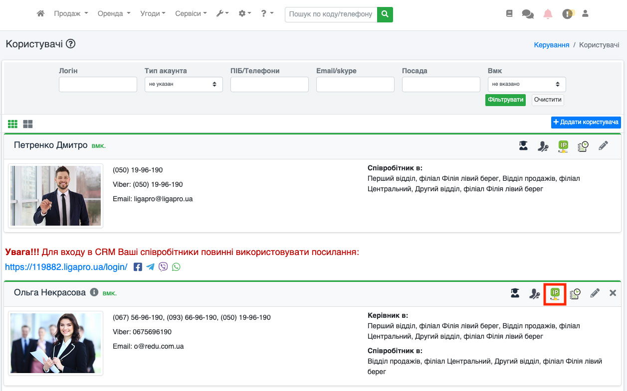 На сторінці, знайдіть потрібного користувача і натисніть на іконку IP (Рис. 331), яка дозволяє налаштувати обмеження доступу за IP адресою користувача. Для чого створена така можливість?