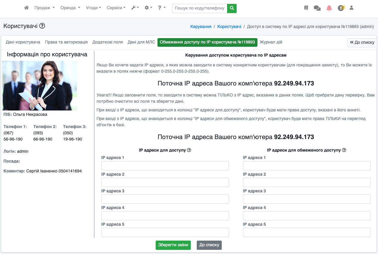 Наприклад, Ви хочете, щоб всі Ваші співробітники мали можливість повного доступу до системи в офісі і при цьому мали доступ до бази і поза офісом, але з обмеженими можливостями. Для цього Ви можете використовувати функцію «обмеження по IP». Щоб налаштувати обмеження доступу по IP, зайдіть в розділ «Управління - Користувачі», виберіть потрібного Вам користувача і натисніть на іконку «IP». У вкладці Ви можете додати до 5 IP для обмеженого доступу і до 5 IP для повного доступу. Також, для зручності, Вам відразу виводиться Ваша поточна IP адреса (Рис.332).