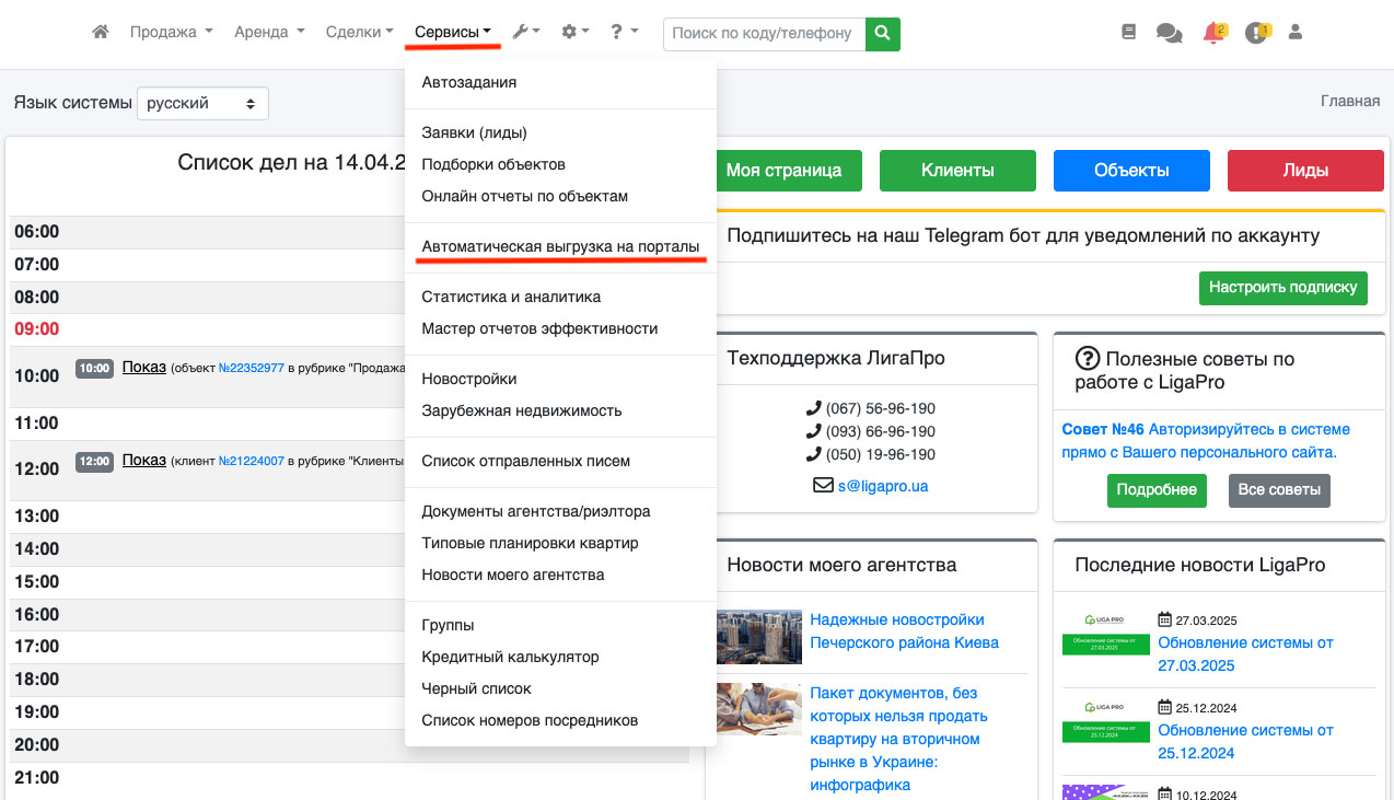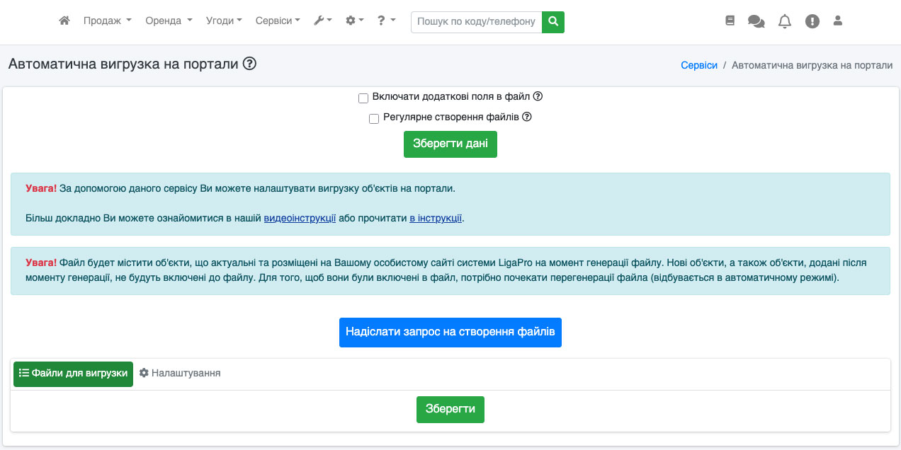 В системі ЛігаПро існує можливість формувати XML файл. XML файл дозволяє вивантажувати всі ваші об'єкти на інші сайти, наприклад, на Ваш інший сайт з нерухомості, на інші дошки та портали. Файл формується в форматі XML Yandex нерухомості, що є найпоширенішим і прийнятим стандартом на території України. Для того, щоб сформувати файл для вивантаження, зайдіть в розділ «Сервіси - Автоматична вигрузка на портали». За замовчуванням файл не сформований і для того, щоб сформувати файл, натисніть кнопку «Відправити запит на створення файлу» (Рис. 334).