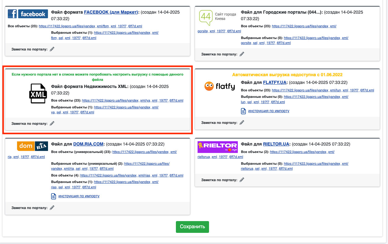 Для формування файлу необхідний певний час і після того, як файл буде сформований, Вам прийде системне повідомлення про те, що файл сформований і готовий. Після чого зайдіть в розділ «Сервіси - Автоматична вигрузка на портали» і Ви побачите посилання на файли з датою і часом останнього формування (Рис. 335).