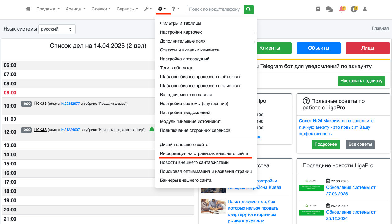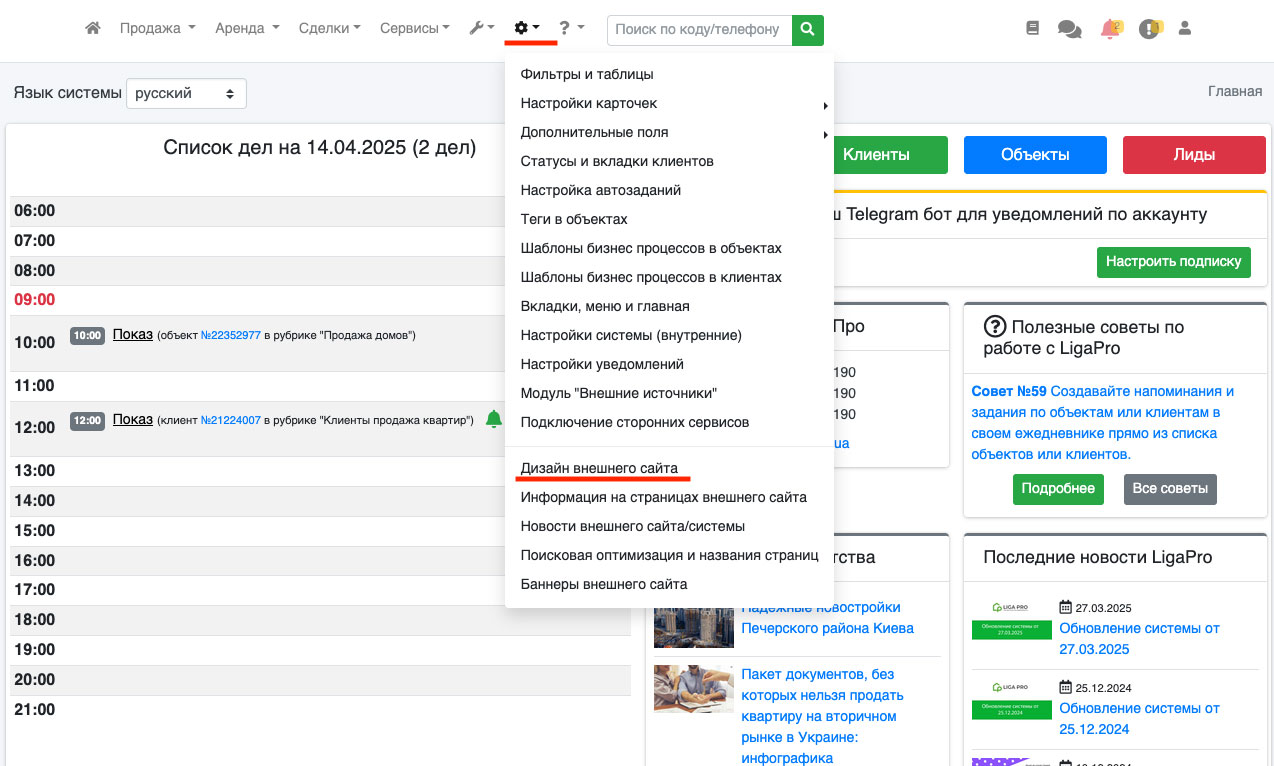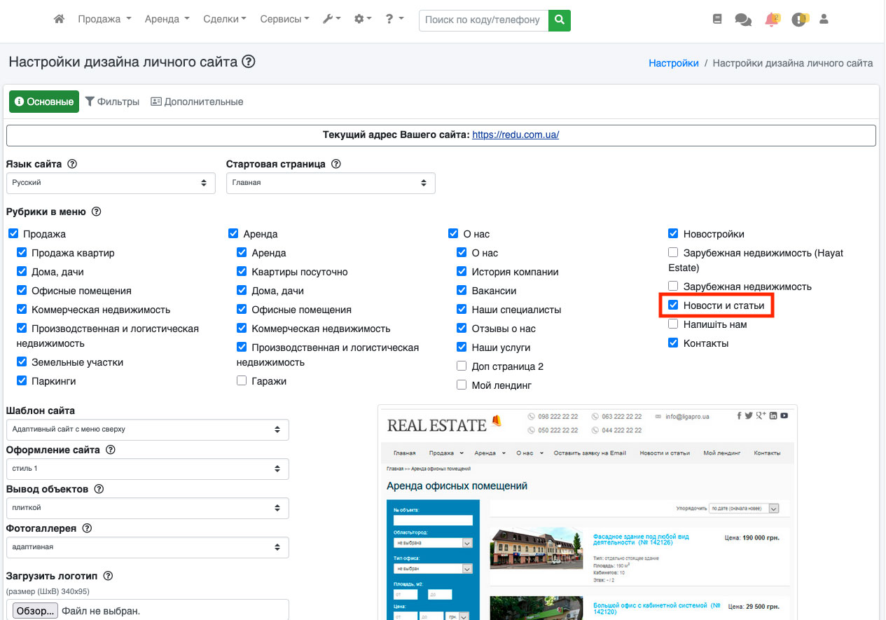 На Вашому персональному сайті передбачений розділ «новини / статті». Щоб включити цей розділ, зайдіть в пункт меню «Налаштування - Налаштування дизайну зовнішнього сайту» (Рис. 362).