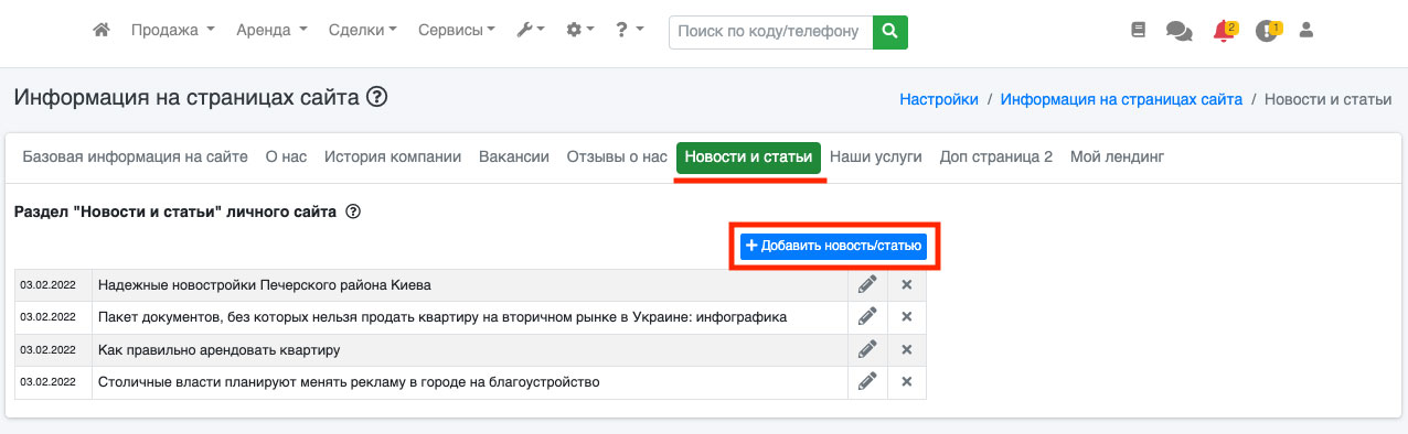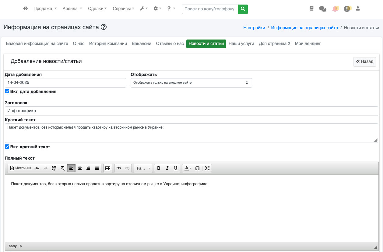 Для додавання статті або новини зайдіть в пункт меню «Налаштування - Інформація на сторінках сайту» (Рис. 364).