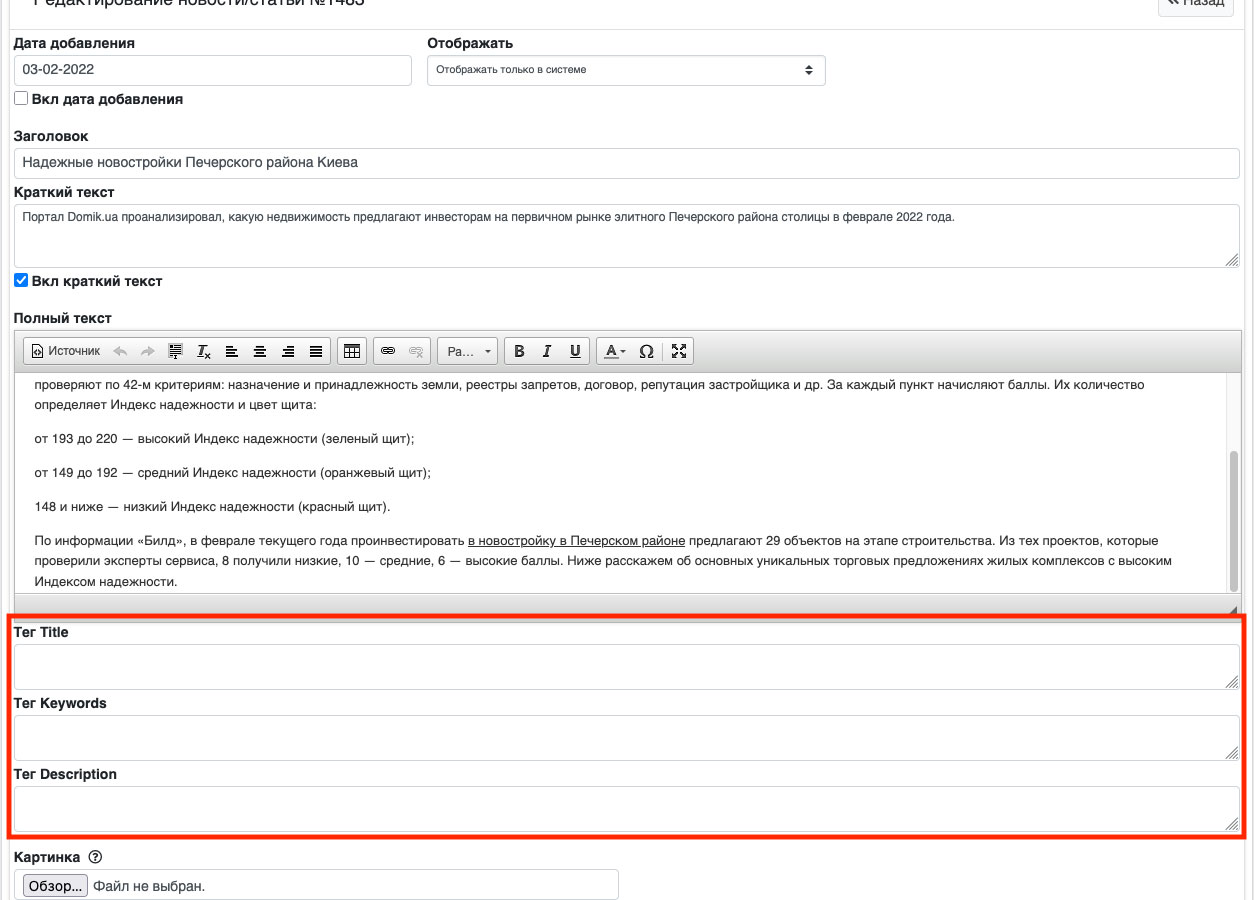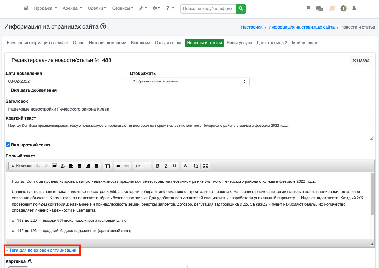 Додатково існує можливість проводити пошукову оптимізацію кожної статті. Для цього при додаванні/редагуванні статті відкрийте посилання «Теги для пошукової оптимізації» (Рис. 368).