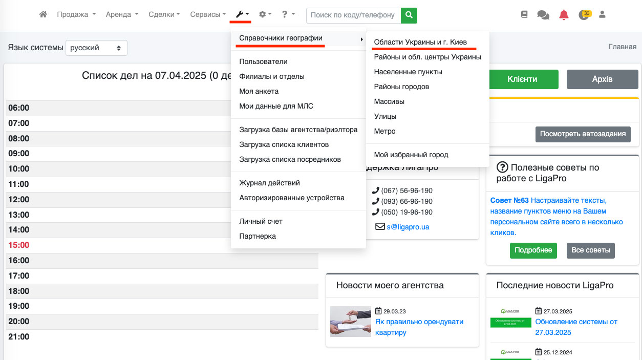 В этом пункте меню Вы можете включить/отключить любую область Украины или город Киев (это удобно в том случае, когда Вы работаете в одной конкретной области и для Вас нет необходимости отображать в системе другие области). Также, в зависимости от необходимости, в системе предусмотрена возможность изменение названия области или города. Например, если Вы работаете только в Киеве и Киевской области, то Вы можете отключить все другие области, а Киев переименовать в «Город», киевскую область в «Область», при этом привязка улиц, районов, населенных пунктов сохранится.