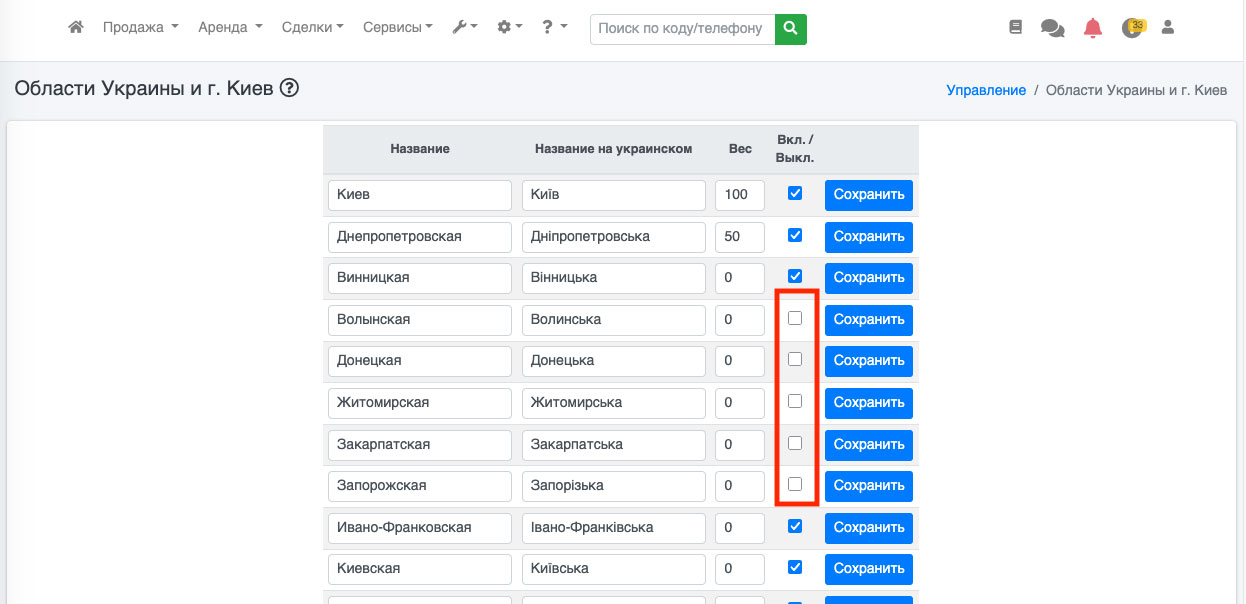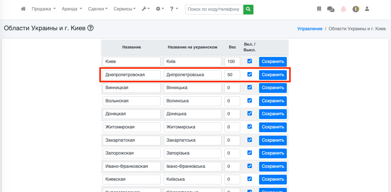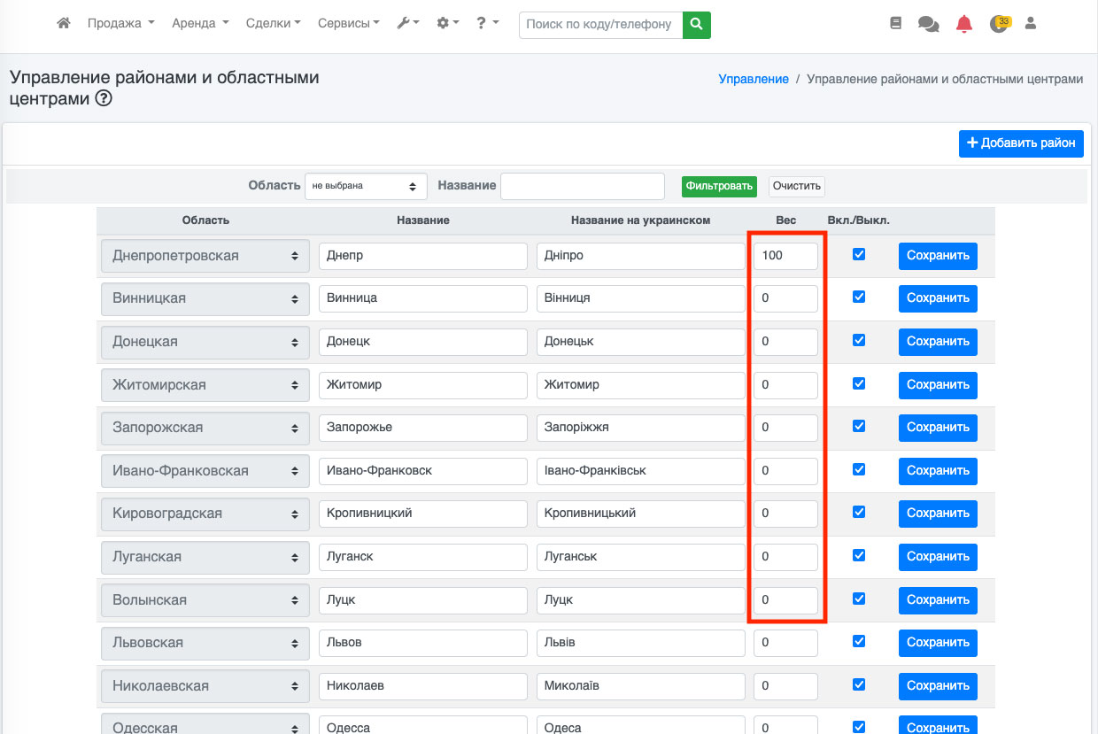 Дополнительно существует возможность сортировки областей в списке. Для этого предназначен такой параметр как «Вес» и если Вы хотите, чтобы определенная область была выше в списке (например, при выборе области в фильтрах или при добавлении объекта) - Вам необходимо указать вес/значение больше, чем всех остальных (например «100» (Рис. 19)). Таким образом, указывая «Вес», Вы можете отсортировать список областей так, как Вам удобно. Для выставления «Веса» используйте только целые числа.