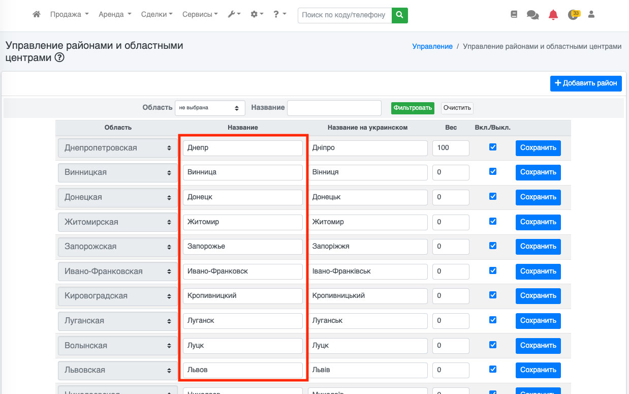 Чтобы переименовать область, просто укажите необходимое название в нужном населенном пункте и нажмите кнопку «Сохранить» (Рис. 16).