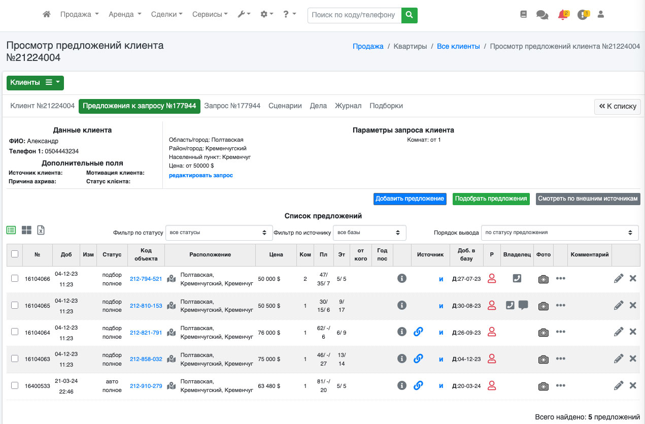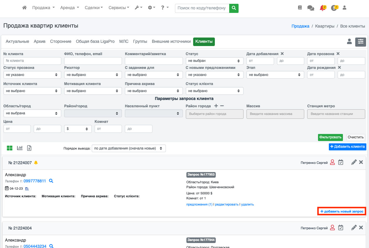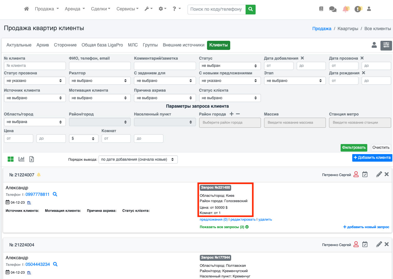 Звертаємо Вашу увагу, що доданий Вами запит буде також відображатися в списку клієнтів (Рис. 430). Ви можете відразу подивитися скільки зараз є пропозицій (червоним буде вказано кількість нових автоматично підібраних пропозицій, які Ви ще не переглядали), також Ви можете відредагувати запит натиснувши на кнопку «Редагувати» або видалити запит.