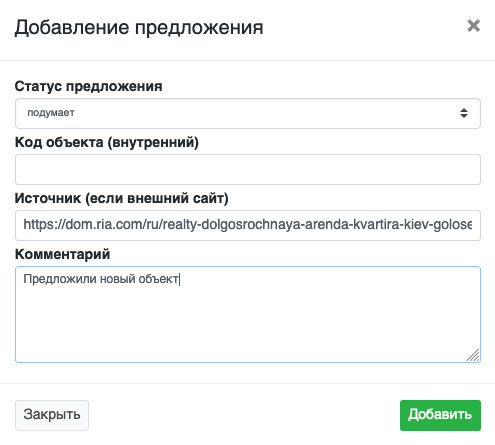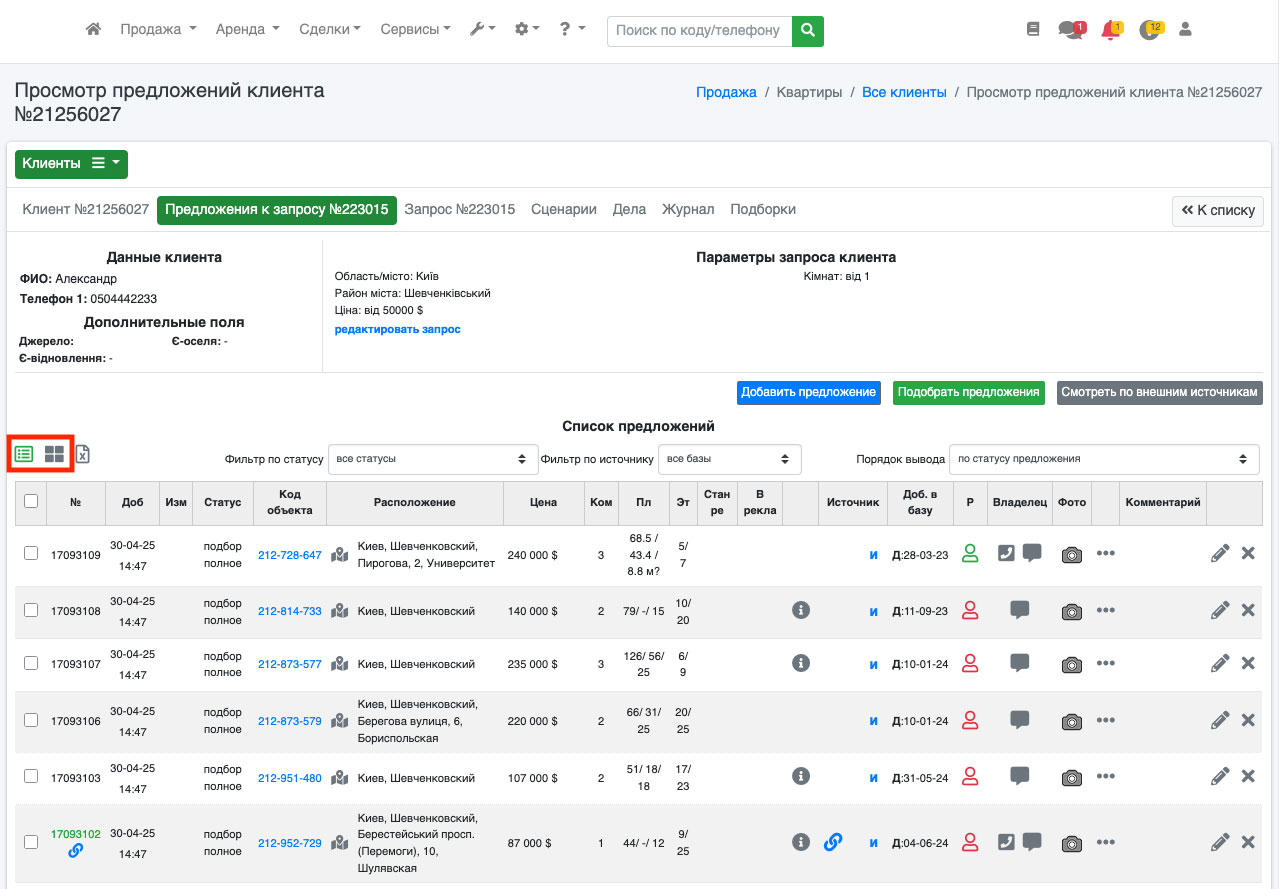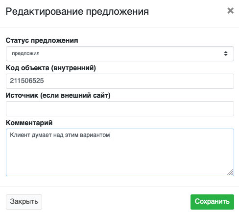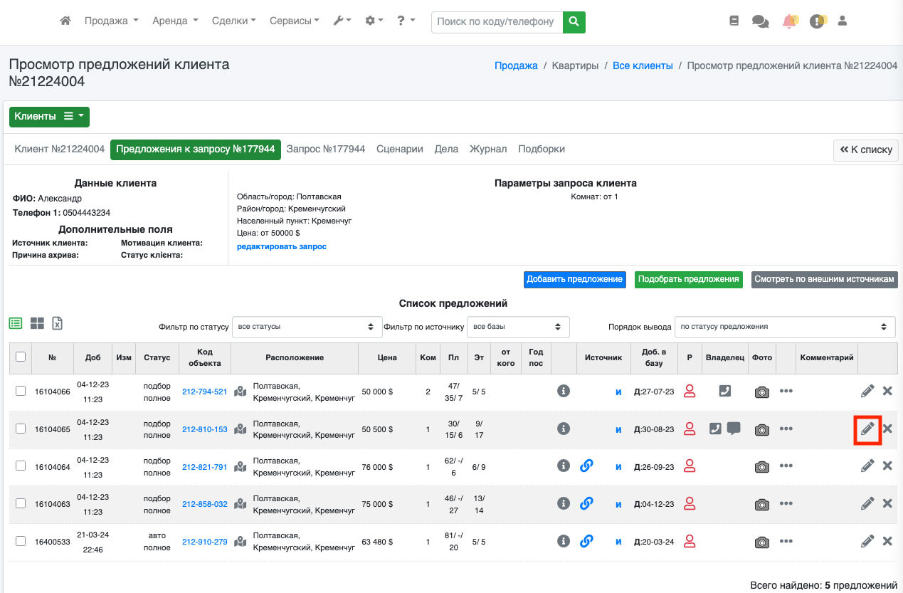 Все, що Вам необхідно - це ознайомитися з об'єктами, які були підібрані для клієнта. До кожної пропозиції у Вас є можливість додати коментар і поставити потрібний статус. Для цього в списку об'єктів натисніть на іконку «Олівець» (Рис. 423).