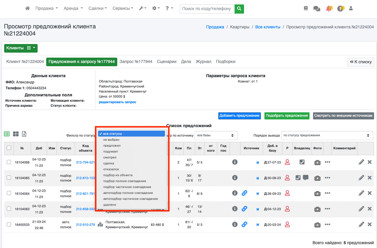 Існують наступні статуси: дивився, угода, відмовився, підбір з об'єкта, був видалений. Ви можете в налаштуваннях змінити поточні або додати власні статуси (див. налаштування статусів пропозицій під клієнта). Всі зміни статусу фіксуються, і Ви в будь-який момент зможете подивитися коли і ким був змінений статус пропозиції. Також система дозволяє фільтрувати по статусах, наприклад щоб швидко відібрати ті пропозиції, які були запропоновані клієнту (Рис. 425).
