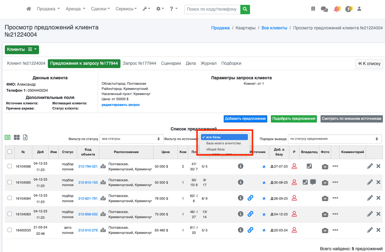 Також, для зручності роботи є фільтр за джерелом підбору, наприклад можна відфільтрувати тільки ті об'єкти, які були підібрані зі своєї бази (Рис. 427). Для візуальної наочності всі об'єкти, які були відібрані із загальної бази ЛігаПро, в графі 'ріелтор' позначаються у вигляді блакитної іконки рієлтора, всі Ваші об'єкти у вигляді червоної іконки рієлтора, а об'єкти Ваших колег, які працюють в Вашому акаунті - у вигляді сірої або зеленої іконки рієлтора (якщо об'єкт не закріплений за ріелтором).