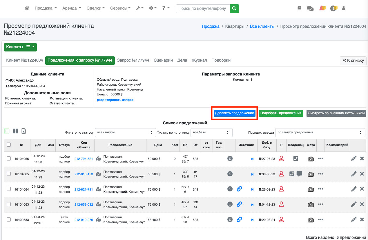 У Вас завжди існує можливість в ручному режимі додати пропозицію для клієнта. Для цього, на сторінці списку пропозицій, натисніть праворуч над таблицею кнопку «Додати пропозицію» (Рис. 428).