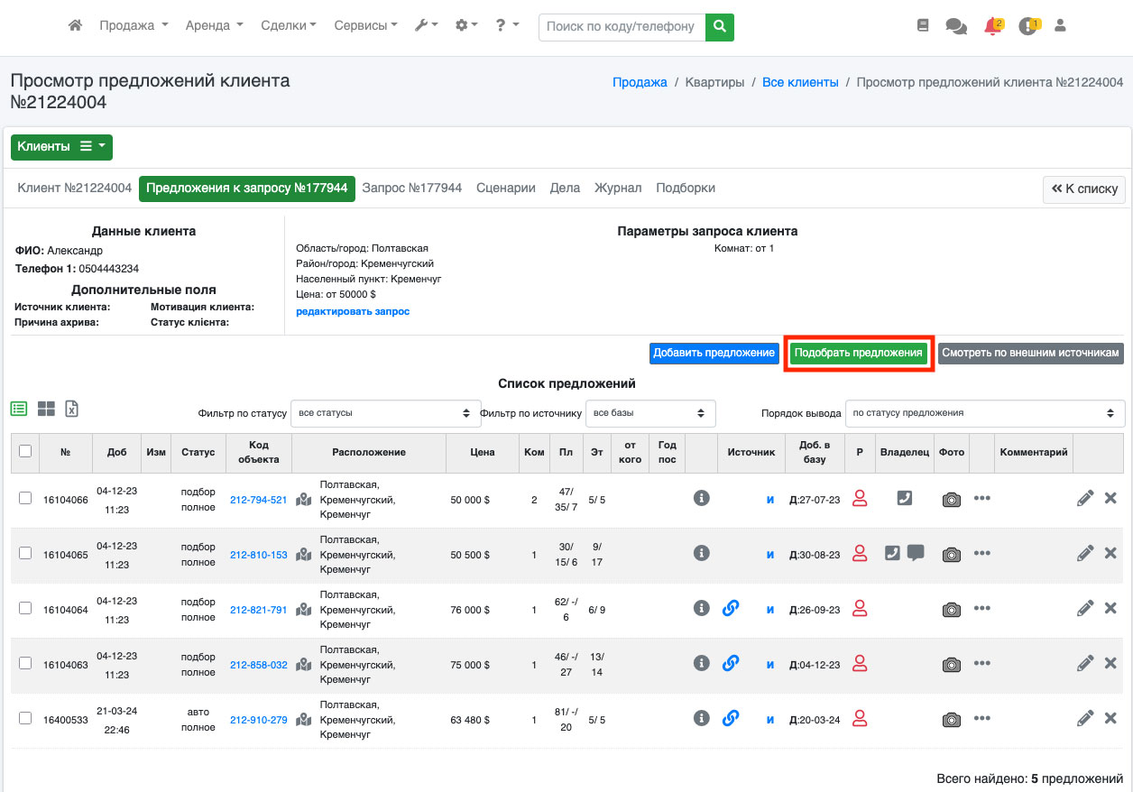 Після того, як Ви зберегли запит, прямо на цій сторінці у Вас з'явиться кнопка «Підібрати пропозиції» (Рис. 417).