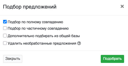 Натиснувши на яку система ще раз запитає звідки необхідно підбирати пропозиції (Рис. 418) і за якими параметрами (повний збіг - система враховує всі зазначені параметри в запиті, частковий збіг - система враховує тільки розташування (місто), кількість кімнат і ціну), підібрали об’єкти і з загальної бази LigaPro, видалити неопрацьовані пропозиції – дозволяє видалити ті об’єкти, які Ви не встигли опрацювати (корисно, якщо запит клієнта змінився і Вам потрібно провести новий пошук, а об’єкти, що були підібрані раніше можуть не відповідати новим критеріям запиту). Після вибору необхідно натиснути на кнопку «Підібрали».