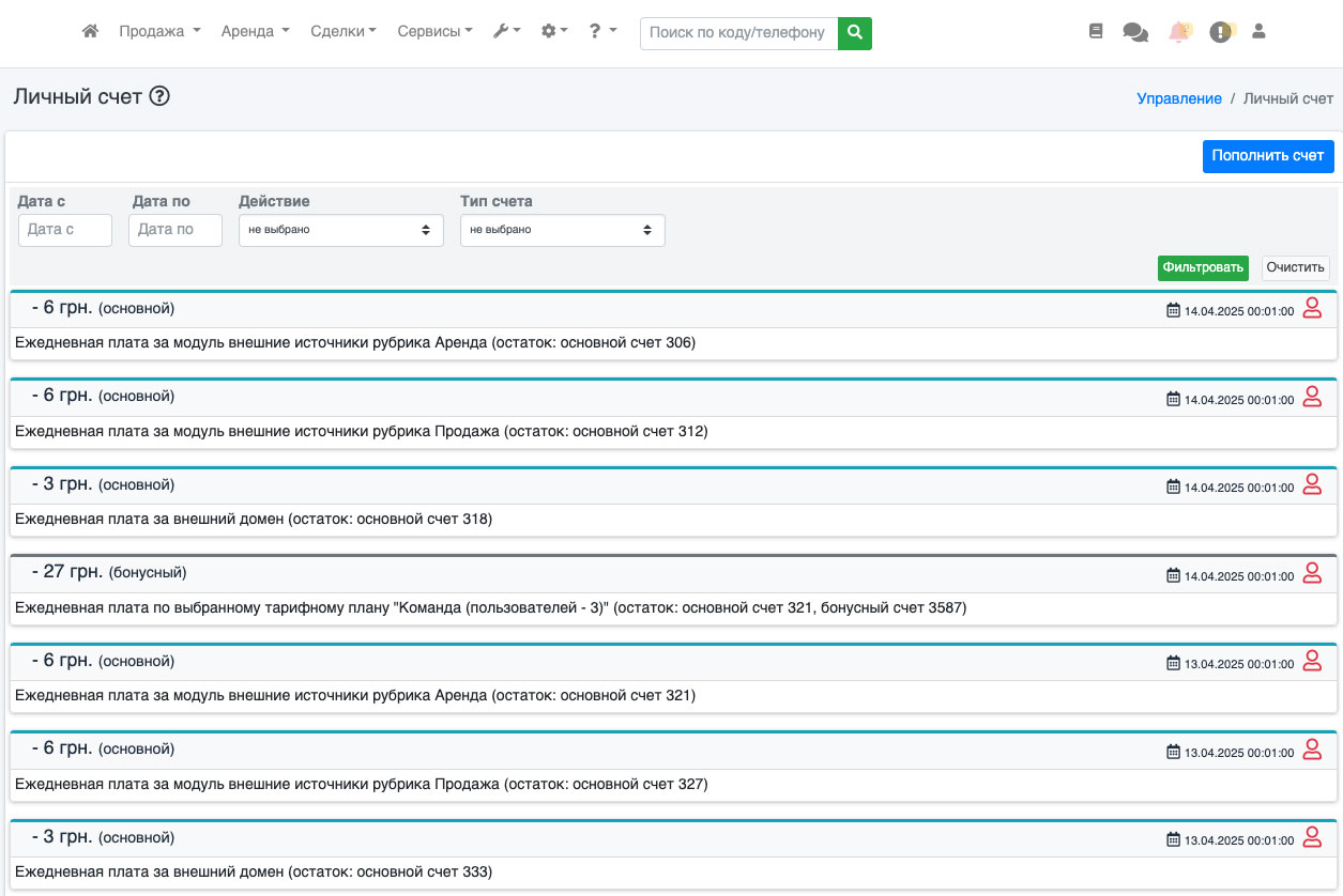 На этой странице также расположена кнопка пополнения счет, с помощью которой Вы можете пополнить свой персональный счет в системе.