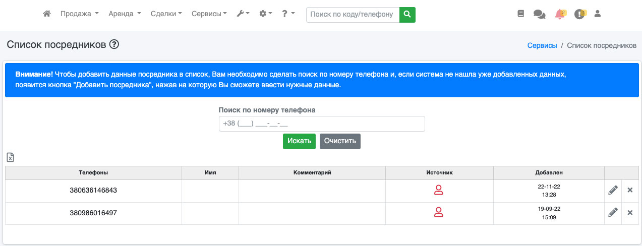 Щоб перевірити номер, введіть номер телефону в форму пошуку і натисніть кнопку «Шукати». Якщо телефон є в базі, Вам покажуть інформацію про ріелтора, якщо такого номера немає в базі - система запропонує додати номер в базу (Рис. 439).
