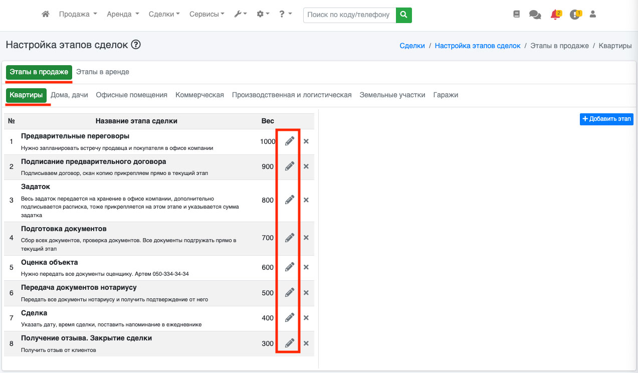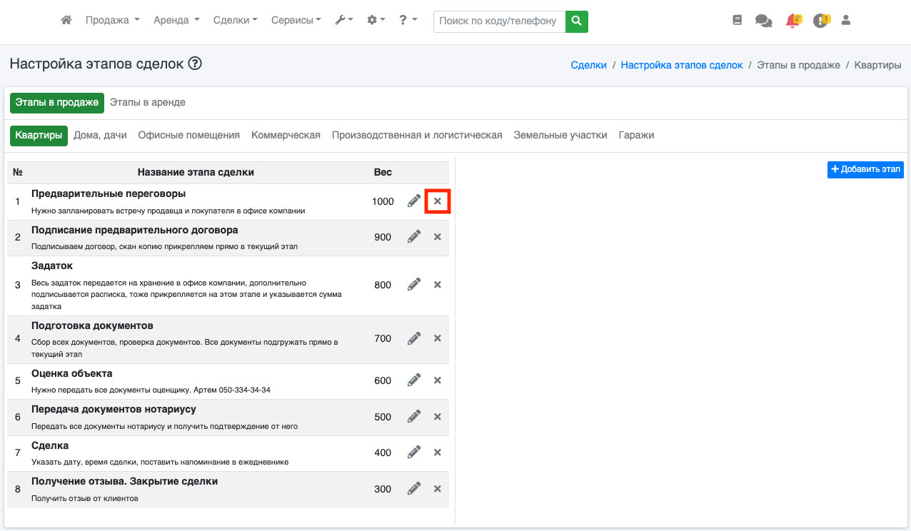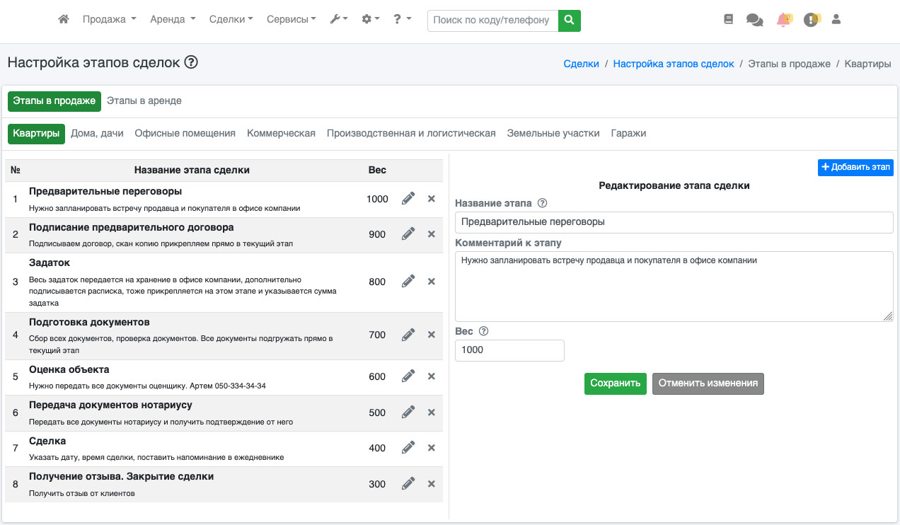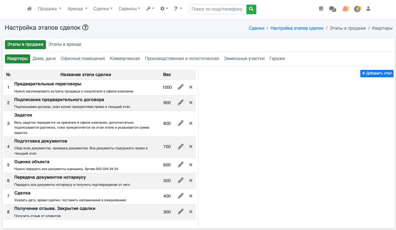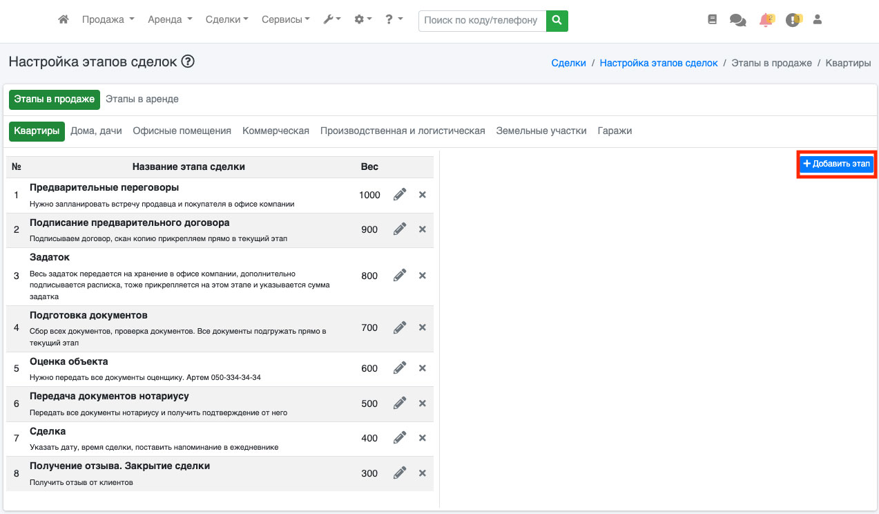 Вес – с помощью этого параметра производится сортировка этапов сделки - чем выше цифра, тем выше этап в списке. Например, у первого этапа должно быть указано самое большое число, чтобы в списке этапов он был первым, у второго число должно быть меньше чем у первого, но больше всех остальных этапов.