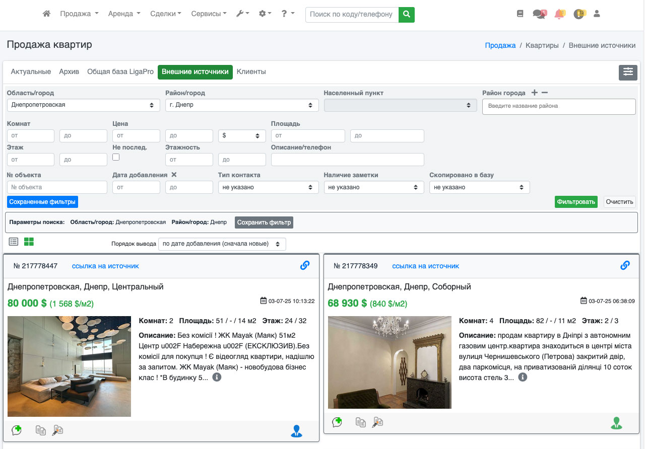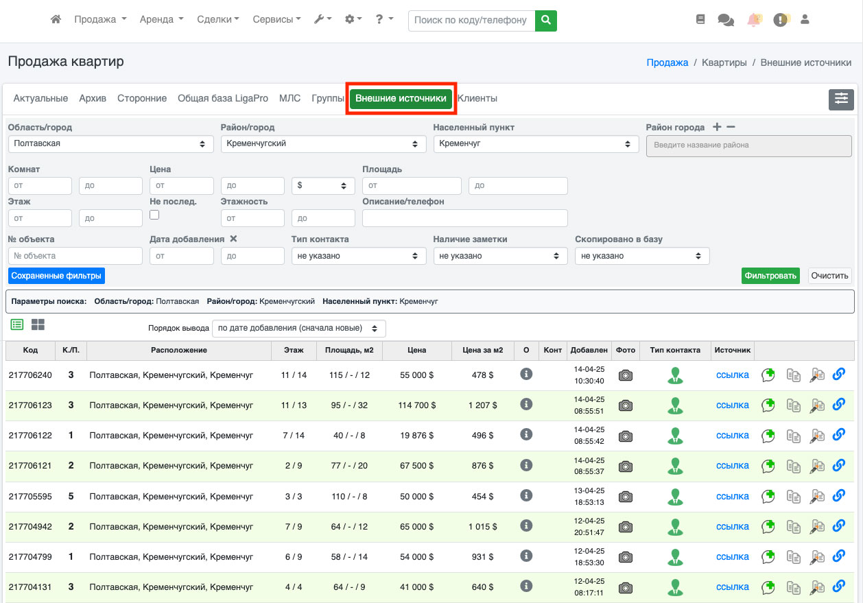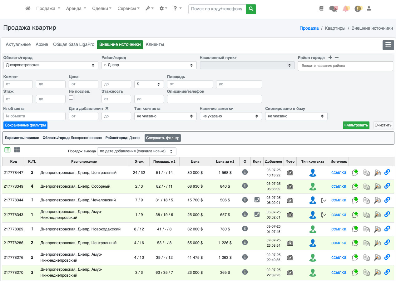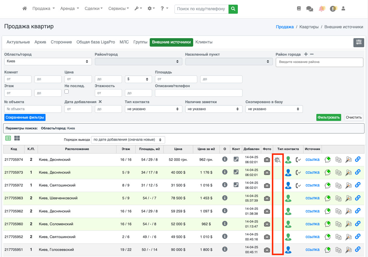 На открывшейся странице Вы можете просмотреть объекты, которые загружены в базу. Важно отметить, что загрузка производится автоматически каждые несколько секунд. Для удобства работы с объектами предусмотрен фильтр, где Вы можете задать параметры поиска в зависимости от рубрики, а также такой параметр как «Тип контакта», где есть два варианта: «Возможно посредник», «Возможно собственник» (Рис. 485). Для удобства предусмотрен поиск по описанию, который позволяет искать объекты по названию ЖК, улице или тексту описания на другом сайте.