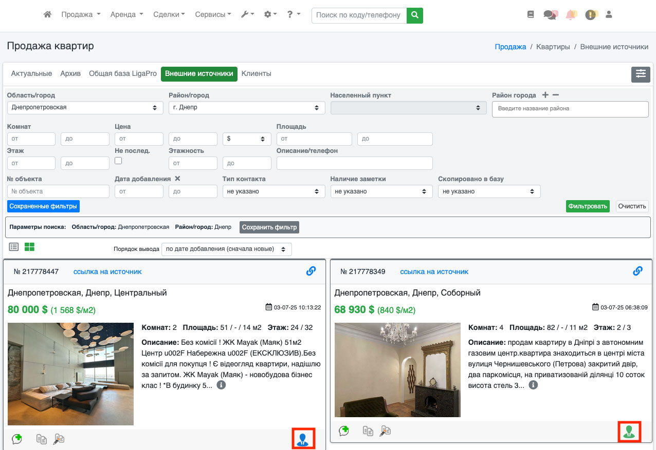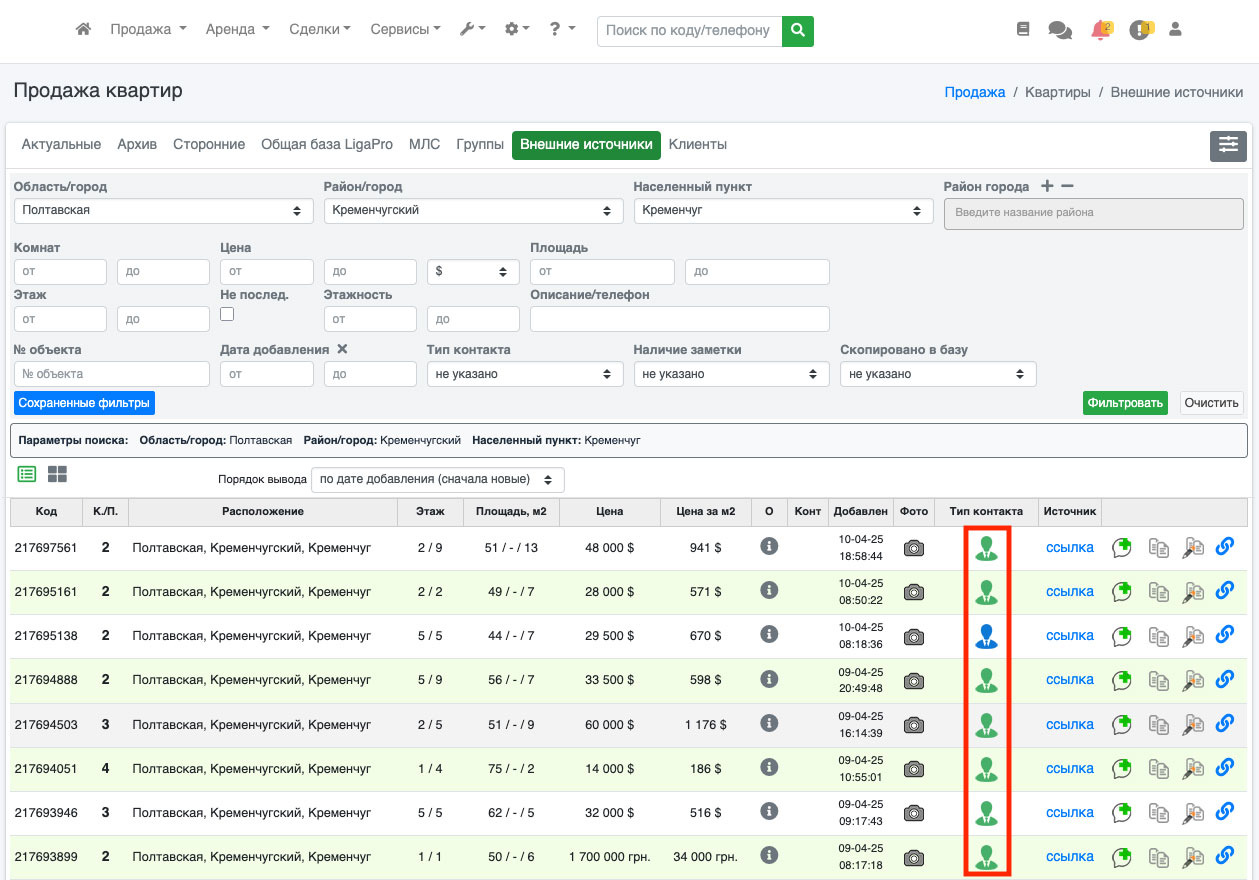 Также, для визуального удобства в списке объектов иконка в виде силуэта обозначает тип контакта. Если силуэт синего цвета - это означает, что скорее всего это посредник, а если силуэт зеленого - то возможно, что это собственник (Рис. 488, Рис. 489).