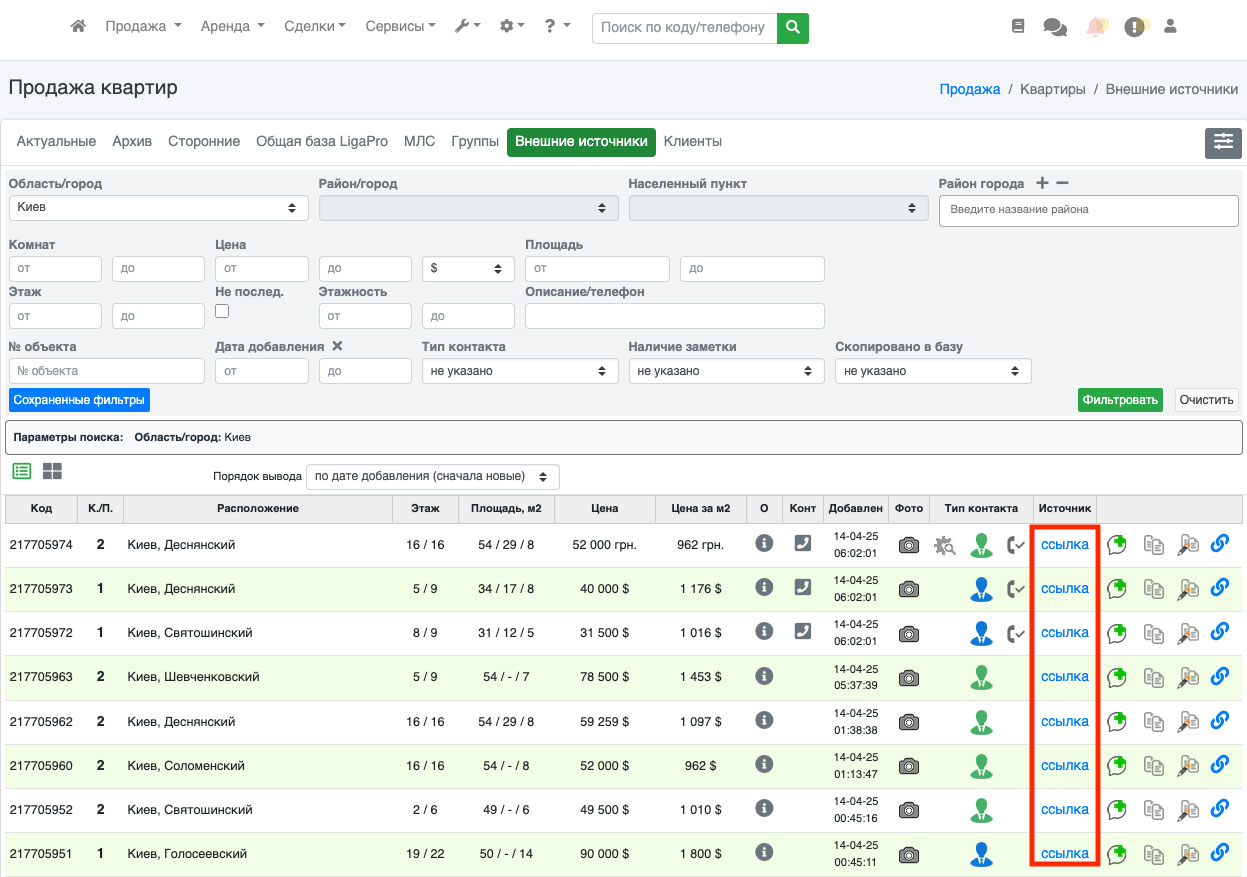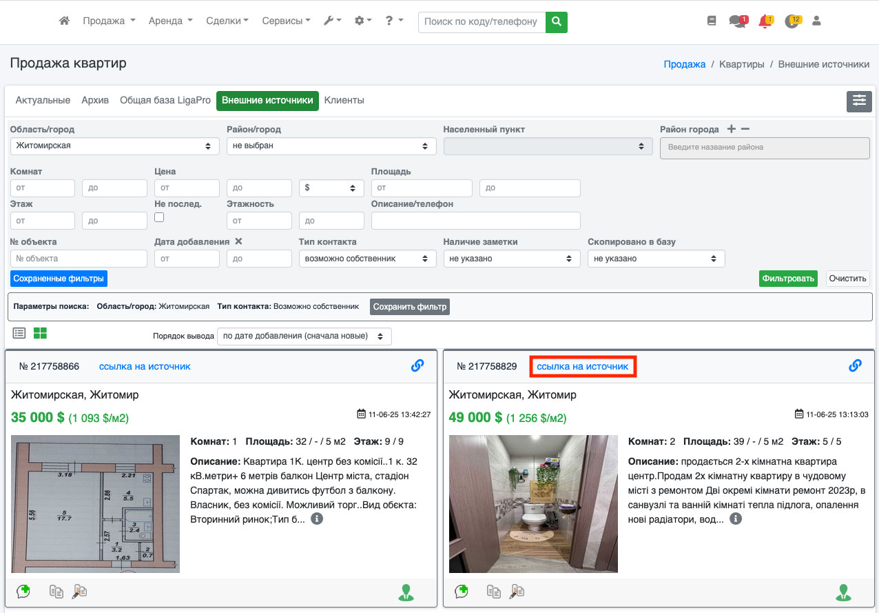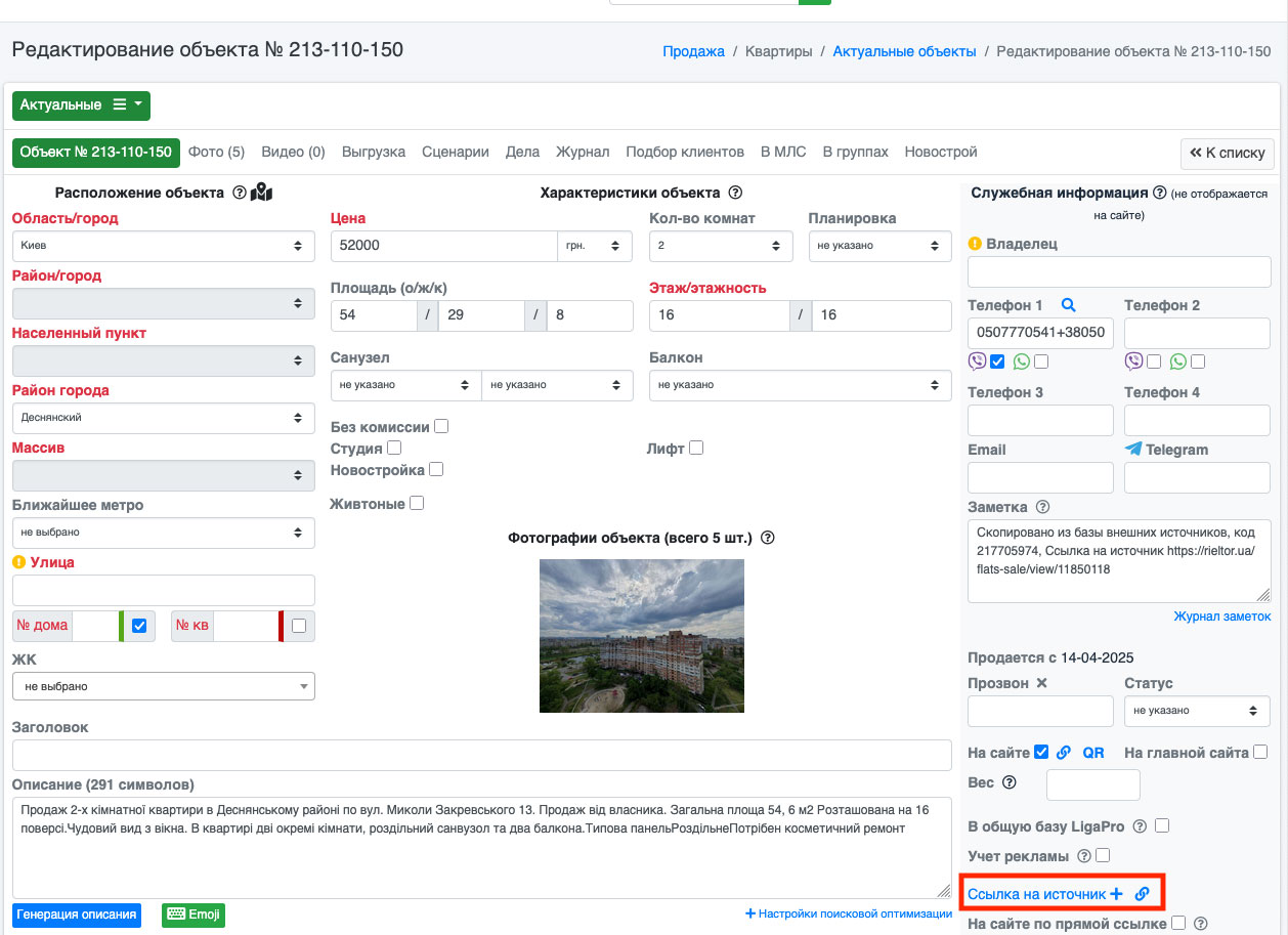 А так же фиксируется прямая ссылка на объект на сайте в источнике объявления в поле «Ссылка на источник» (Рис. 501). По которой Вы можете перейти на оригинал объвления.
