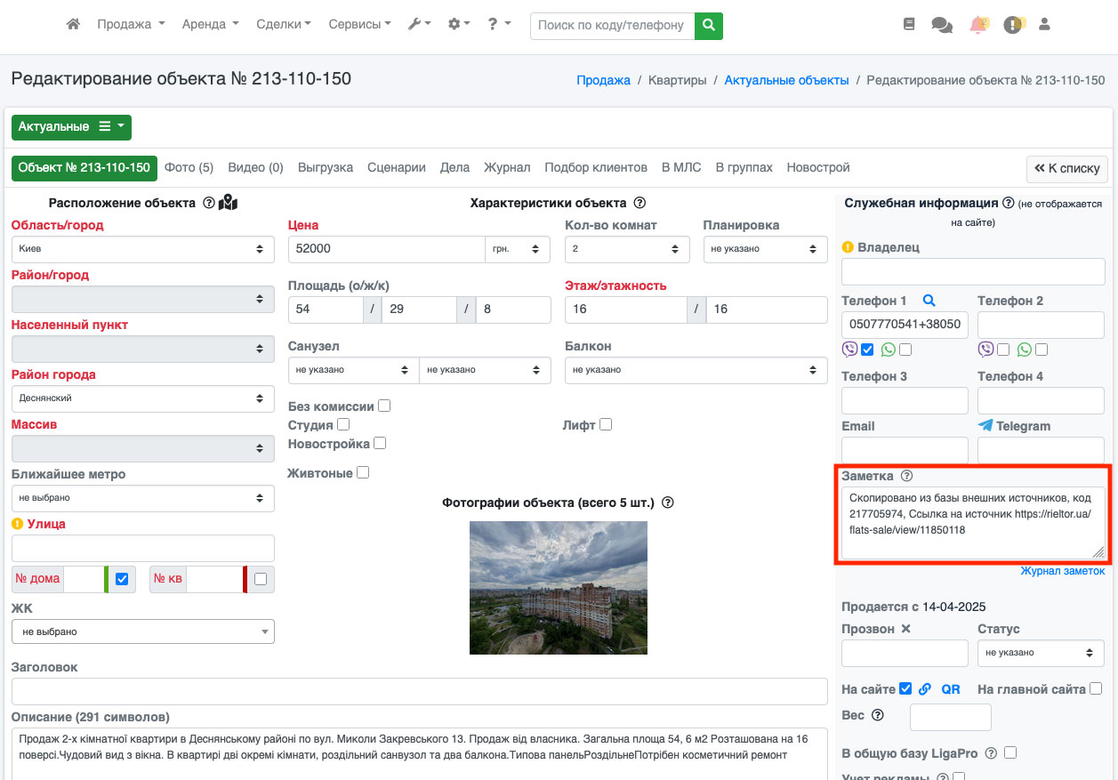 Также после копирование объекта, в заметки сохраняется ссылка на оригинал объявления (Рис. 500).