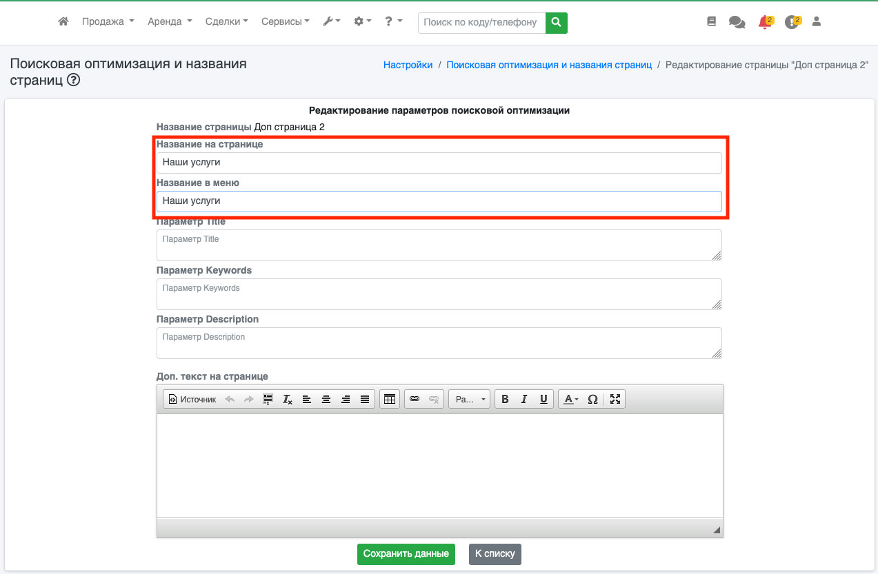 На открывшейся странице введите ее название в меню сайта, введите название на странице (Рис. 514).