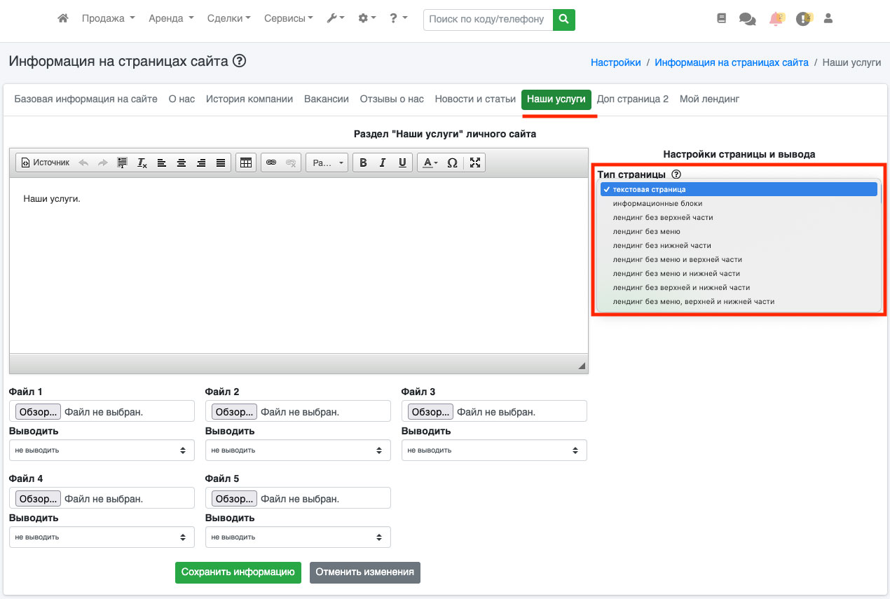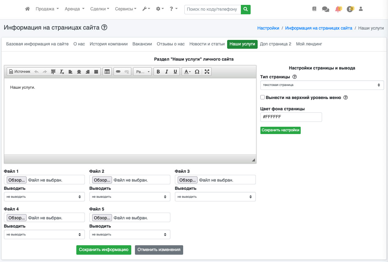 Текстовая страница – данная страница отображает информацию так, как например страницы “О нас”, “Вакансии”, “История компании”. Вы можете написать необходимый текст и прикрепить до 5 файлов, при этом расположение этих файлов на странице Вы можете выбирать самостоятельно (Рис. 518). Обращаем внимание, что, если прикрепляемый Вами файл будет являться изображением, на сайте отобразится сразу изображение, если это, например, doc или pdf файл, на сайте он отобразится в виде ссылки, переходя по которой пользователь может скачать или посмотреть загруженный Вами файл.