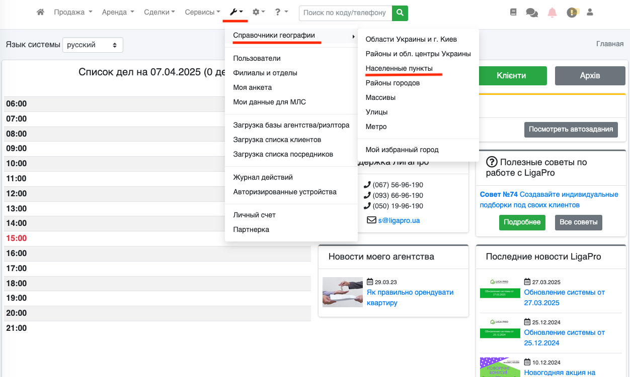 У цьому пункті меню Ви зможете управляти населеними пунктами України. Спочатку за кожною областю закріплені райони, а за кожним районом - його населені пункти.