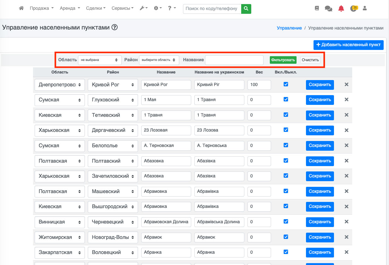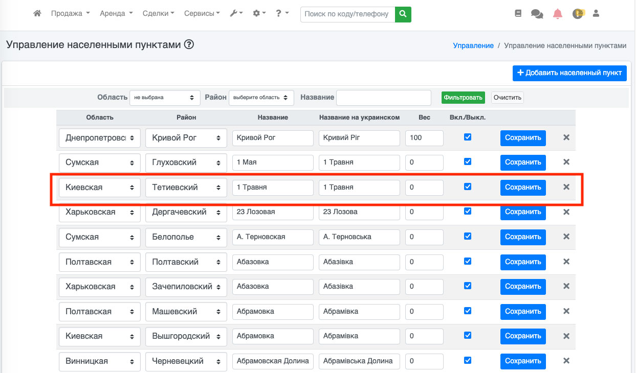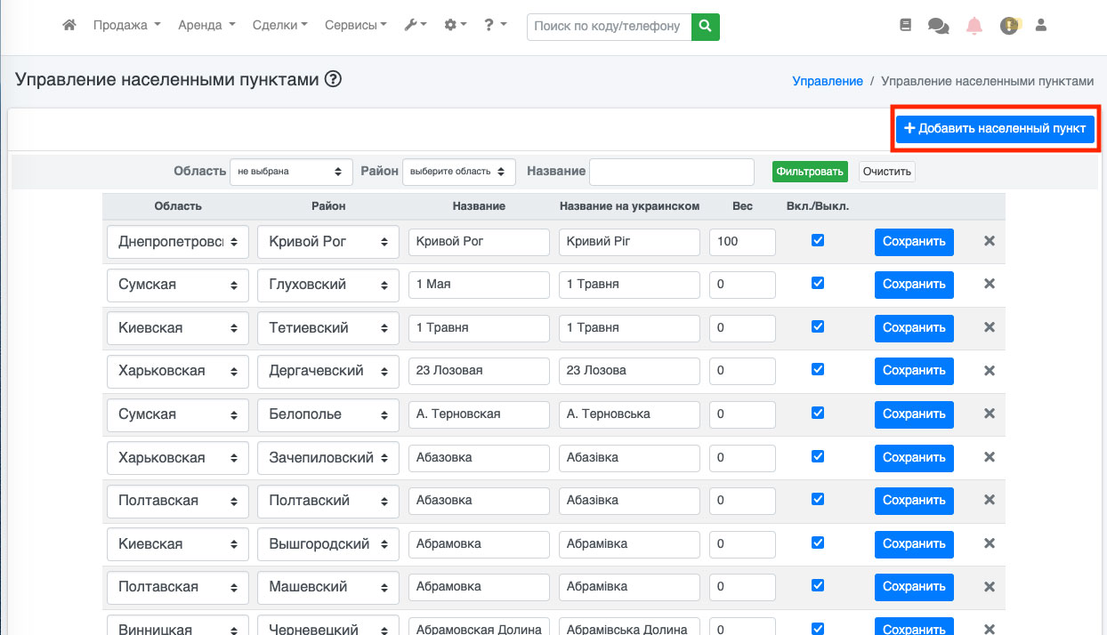 Для редагування населеного пункту Ви просто знаходите його в списку і виконуєте необхідні дії (зміна назви, зміна ваги, статус «Вмк./Вимк», прив'язка його до іншої області і району) та натискаєте кнопку «Зберегти» навпроти цього району (Рис. 30).