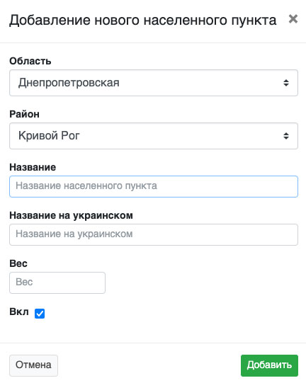 У Вас відкриється діалогове вікно, в якому необхідно вибрати область, після цього вказати район, в який Ви хочете додати новий населений пункт, потім вказати його назву, встановіть вагу, поставте галочку 'Вмк./Вимк' і натисніть кнопку «Додати» (Рис. 29). Після цього населений пункт буде додано в систему.