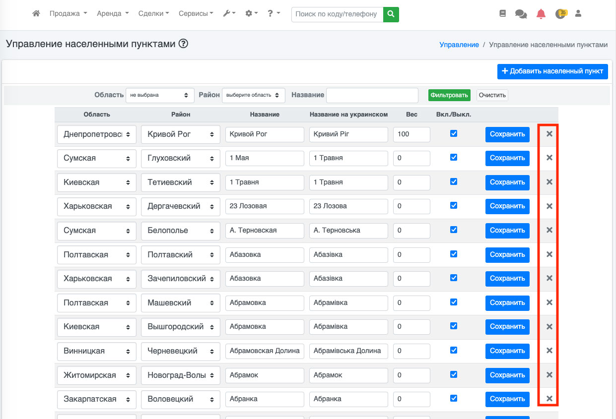 Для видалення населеного пункту Ви просто знаходите його в списку і натискаєте червоний хрестик (Рис. 31).