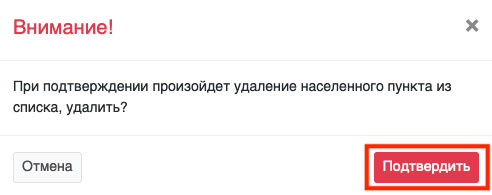 З'явиться діалогове вікно, де потрібно підтвердити видалення натиснувши на кнопку «Підтвердити» (Рис. 32). Після чого населений пункт буде видалений з CRM системи.
