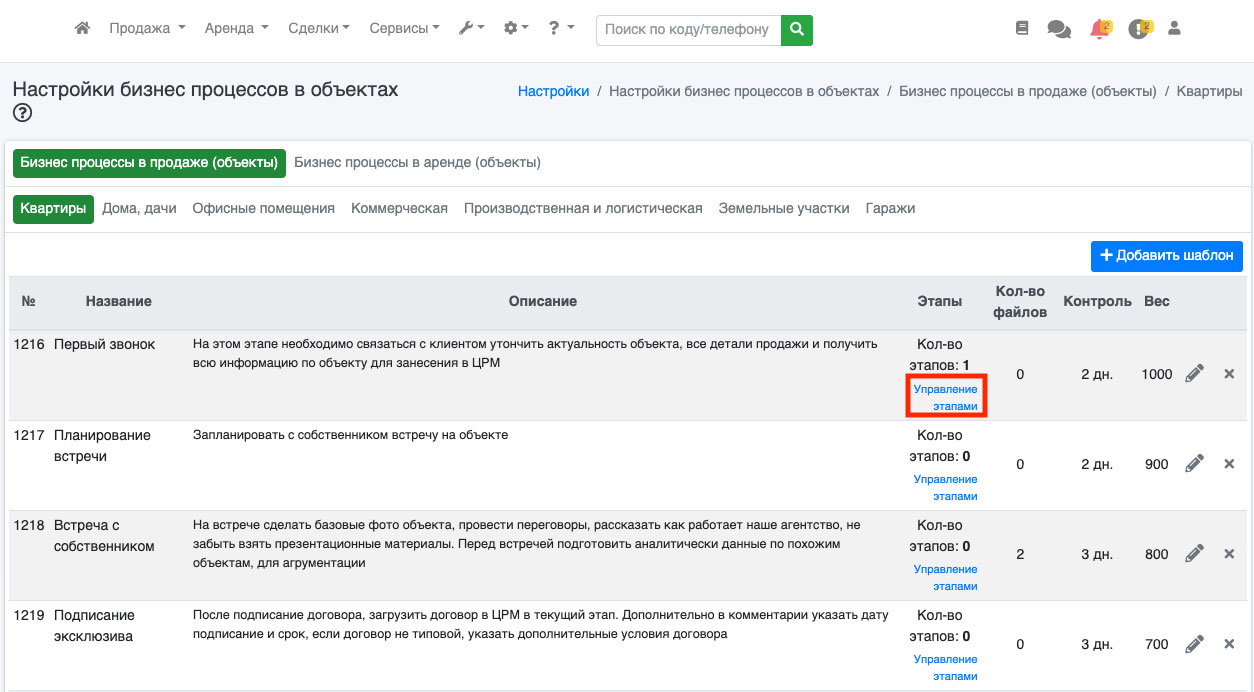Після того, як Ви додали шаблон, можна додати етапи в даний шаблон. Для цього в списку шаблонів знайдіть потрібний Вам шаблон і натисніть на посилання «Управління етапами» (Рис. 651).