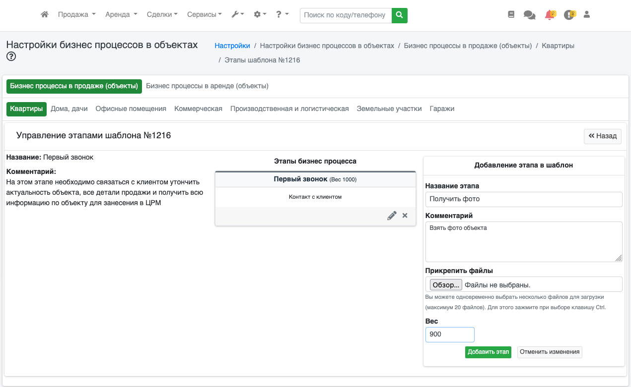 Таким чином, Ви можете створювати необмежену кількість етапів бізнес процесу і сортувати їх згідно з порядком виконання. Щоб прив'язати бізнес процес до потрібного об'єкту - зайдіть в редагування об'єкта (Рис. 655).