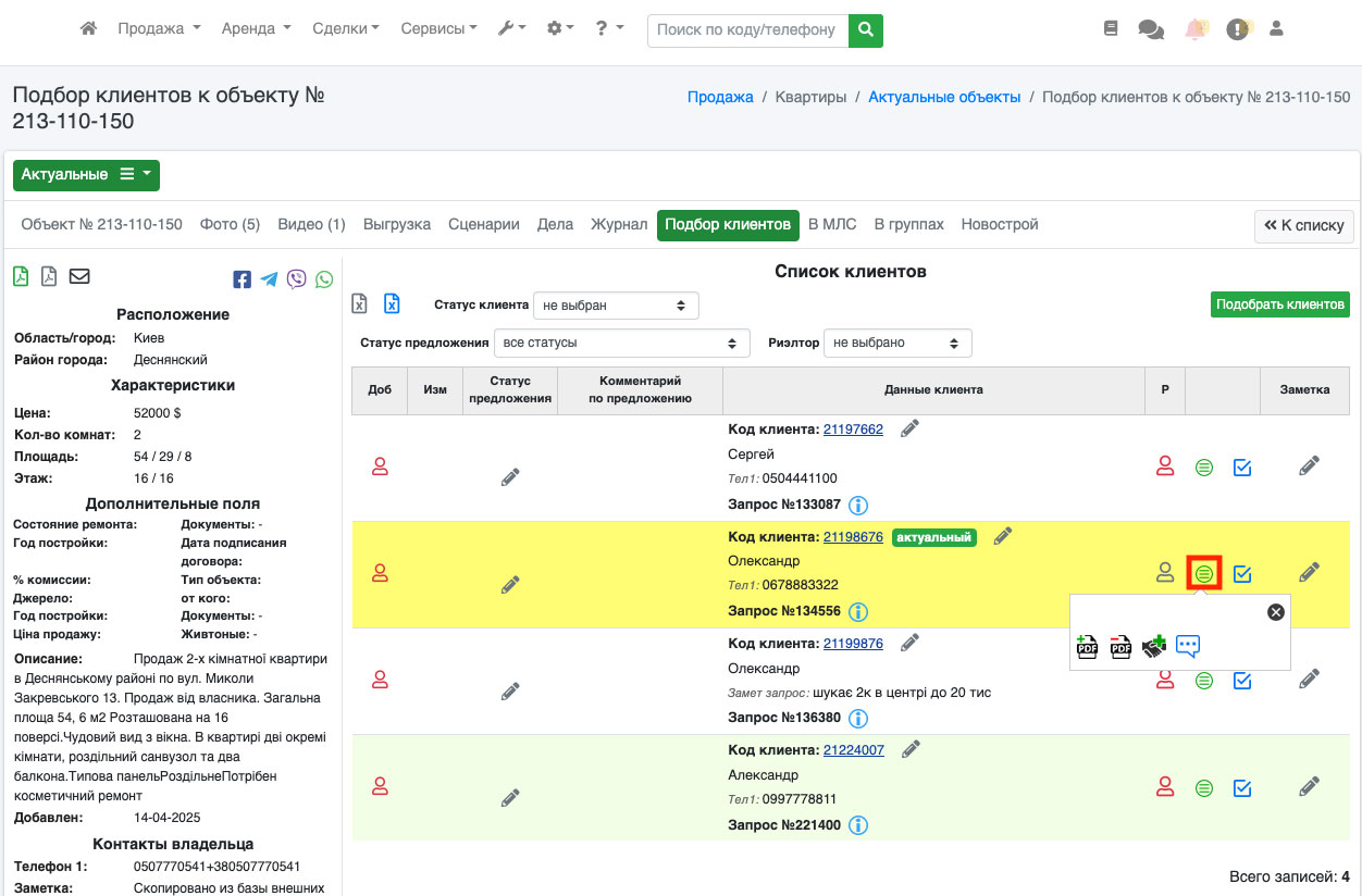 В том случае, если у вас большая база клиентов, вы можете воспользоваться дополнительными фильтрами по статусу клиента, статусу предложения, а также по риэлтору, которому принадлежит этот клиент (Рис. 688). Это существенно упростит поиск нужного клиента.