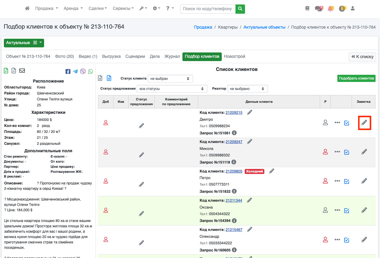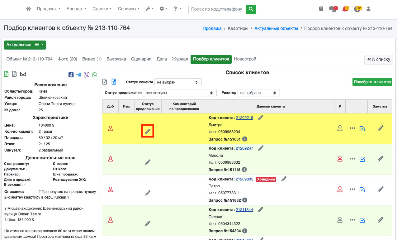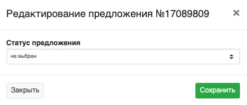 Также существует возможность редактировать статус предложения под клиента. Для этого нажмите на иконку «карандаша» рядом с нужным клиентом (Рис. 685).