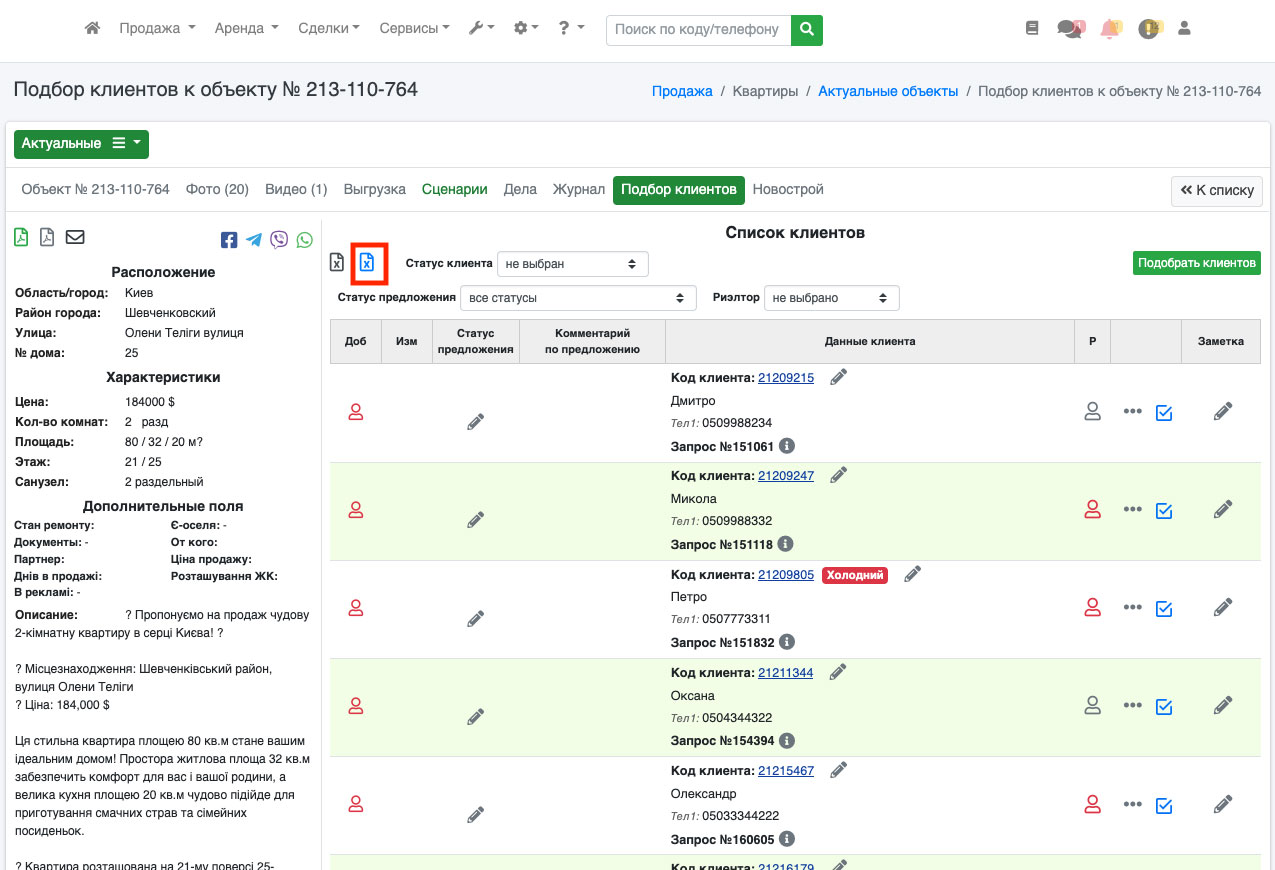 Мы предусмотрели возможность скачивания списка клиентов с частично закрытыми номерами (например, если вы хотите показать собственнику реальный список потенциальных клиентов на его недвижимость). Для этого в списке клиентов под объектом нажмите на синюю иконку Excel, и система предложит сохранить список клиентов на ваше устройство (Рис. 691).