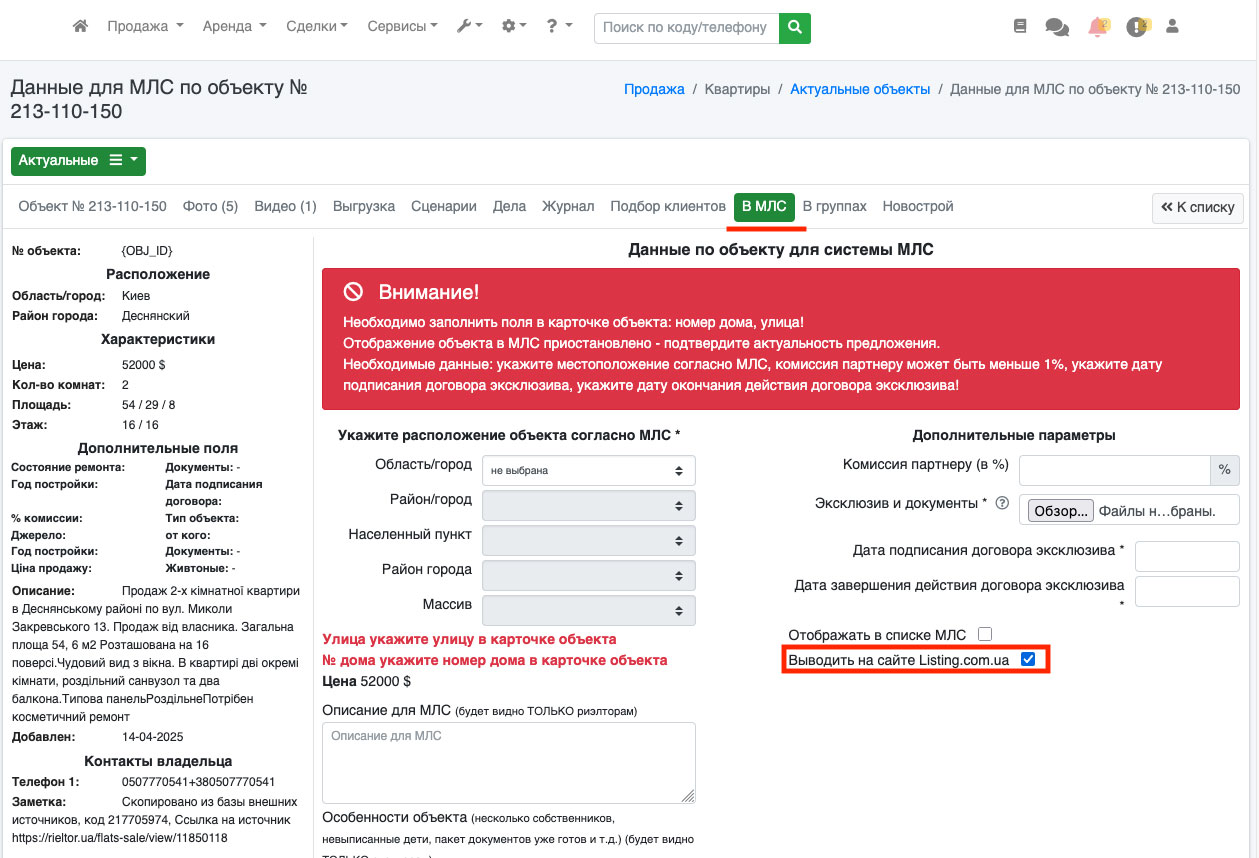 Заповніть всі обов'язкові параметри по об'єкту для його публікації, поставте галочку «Виводити на сайті Listing.com.ua» і натисніть кнопку «Зберегти зміни». Якщо Ви все зробили правильно, об'єкт буде опублікований на порталі Listing.com.ua.