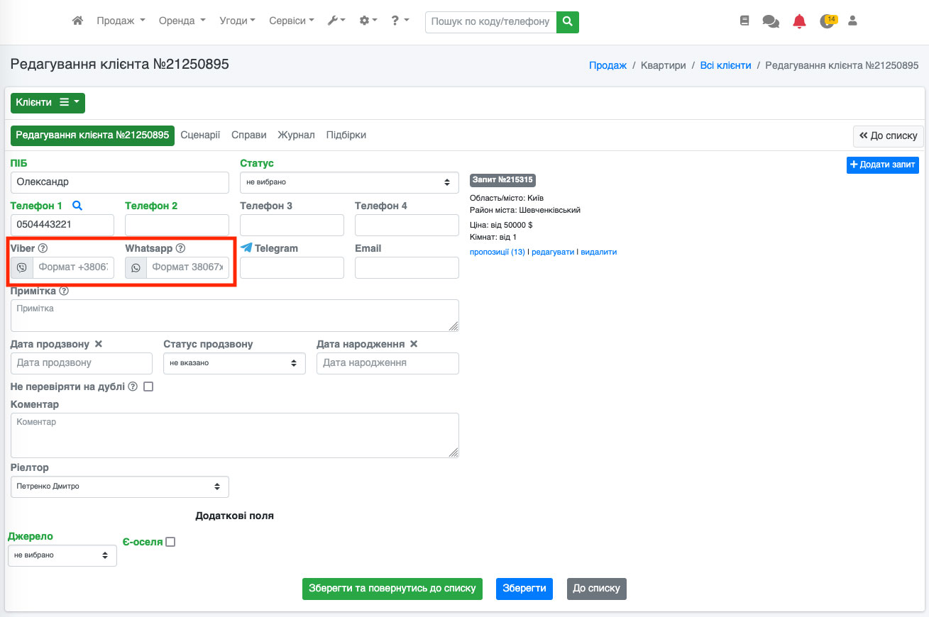 На сторінці редагування клієнта знайдіть поля для введення Viber і WhatsApp номера (Рис. 777). Звертаємо Вашу увагу, що номер Viber і WhatsApp потрібно вводити в певному форматі, щоб система могла коректно розпізнавати номери клієнтів. Формат телефону Viber: +38067ХХХХХХХ. Формат телефону WhatsApp: 38067ХХХХХХХ.